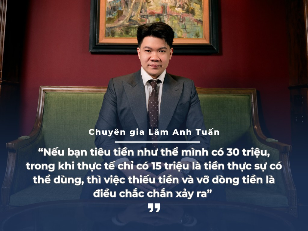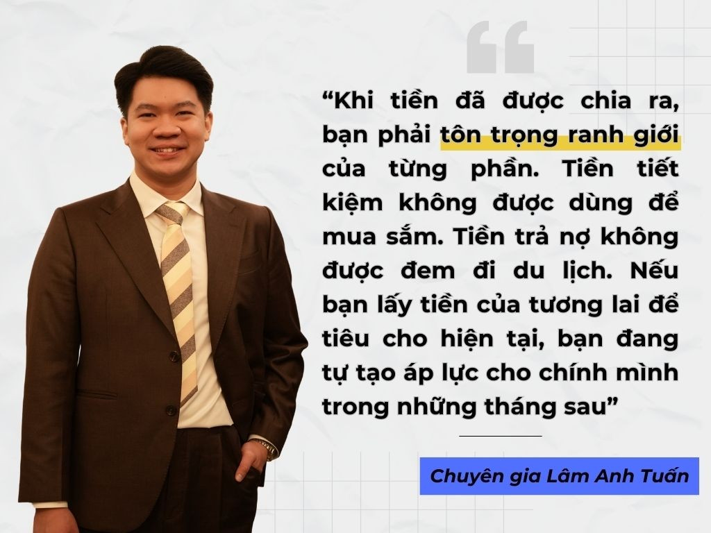 Theo ông Lâm Anh Tuấn, rất nhiều người có thói quen nhận tiền rồi để tất cả chung vào một tài khoản và tiêu theo cảm xúc: cần thì rút, thích thì mua, vui thì chi. Cách này gần như chắc chắn dẫn đến vỡ dòng tiền vào cuối năm.