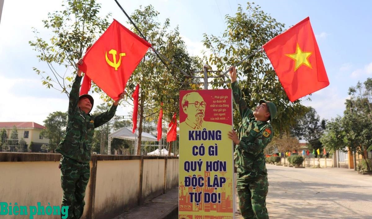 Cán bộ Đồn Biên phòng Bản Giàng treo cờ Tổ quốc, cờ Đảng trên tuyến đường giao thông ở xã Hương Xuân để chuẩn bị cho chương trình. Ảnh: Viết Lam