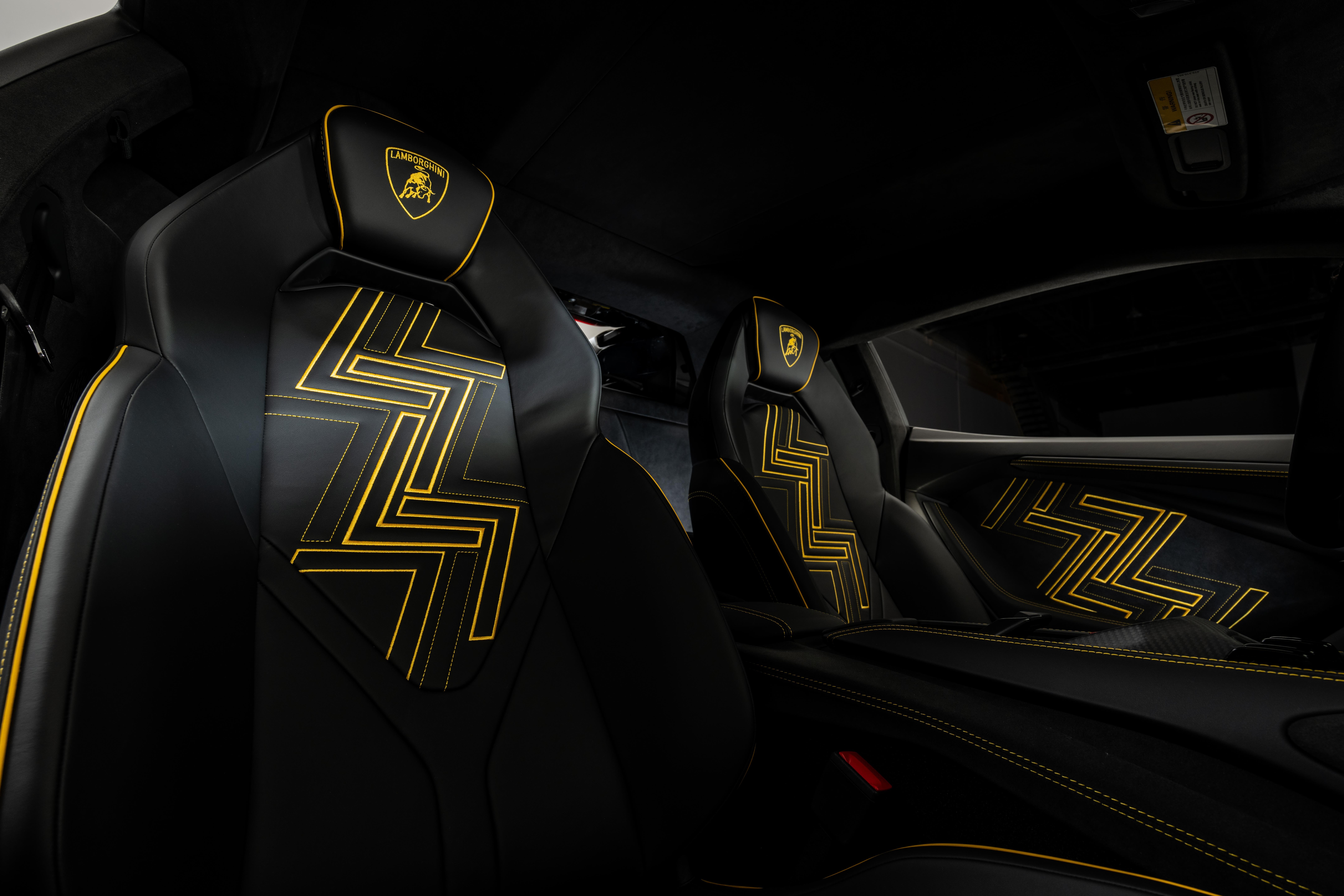 Bên trong, bản 20th Anniversary nhấn mạnh tay nghề thủ công. Các đường chỉ và viền màu Giallo Taurus đồng điệu với ngoại thất, tạo sự liền mạch thị giác. Họa tiết monogram Ad Personam chữ “L” – diễn giải hiện đại của motif truyền thống Lamborghini – xuất hiện có chủ đích, đem lại cảm giác bespoke rõ rệt.