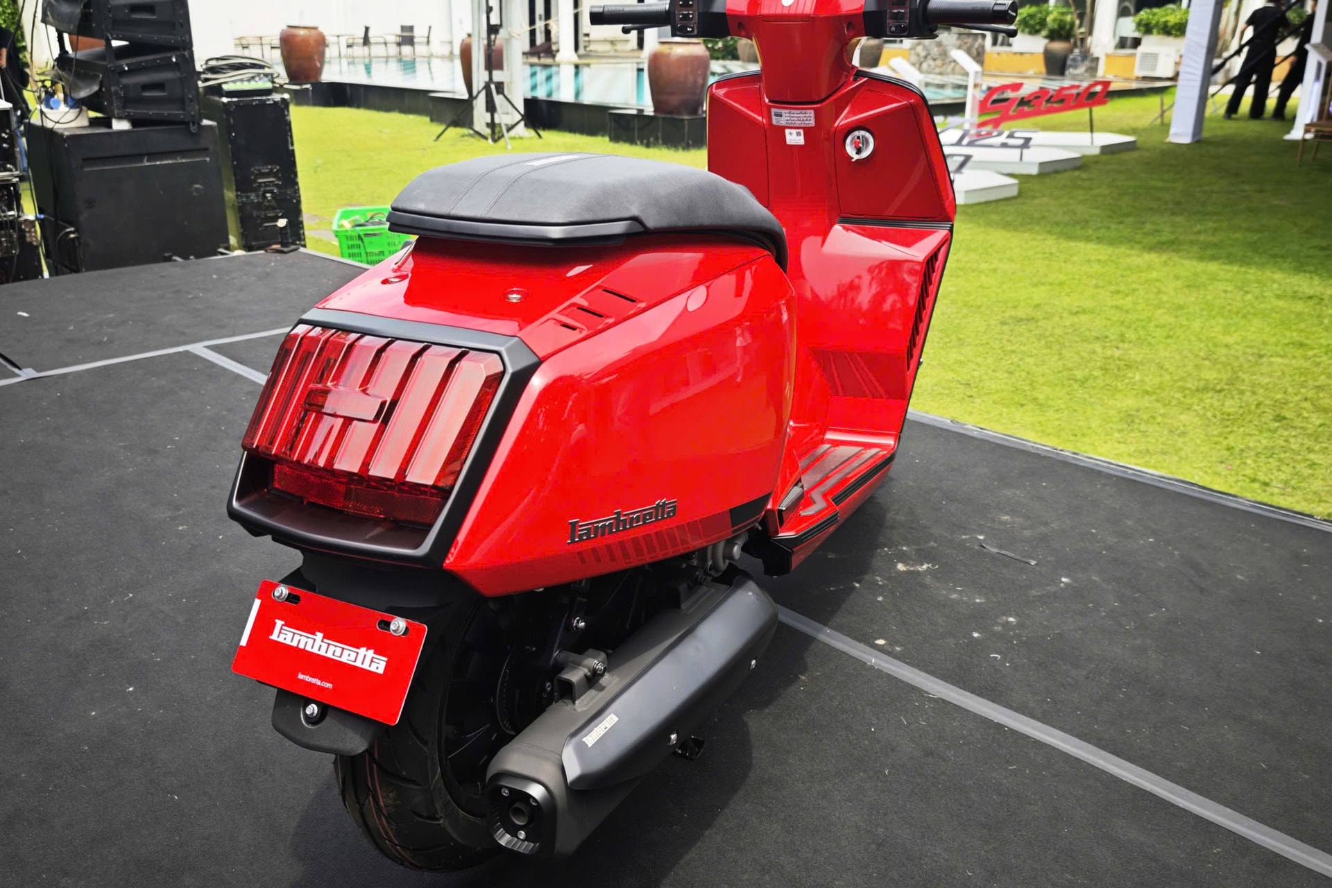 Ở đuôi, đèn hậu bản lớn được đặt nhô ra phía sau, làm tăng độ nổi khối và giúp chiếc xe dễ nhận diện từ xa. Tổng thể cho thấy Lambretta ưu tiên chất “thời trang” nhưng giữ đủ nét khỏe, phù hợp khách hàng trẻ thích kiểu dáng cỡ lớn, góc cạnh.