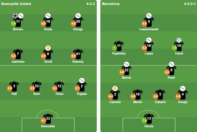Barcelona nỗ lực kiểm soát bóng nhưng vấp phải sự kháng cự quyết liệt từ tuyến giữa chủ nhà. Sandro Tonali và Joelinton chơi cực kỳ cơ động, phong tỏa thành công tầm hoạt động của Pedri và Marc Bernal. Đội bóng xứ Catalan chủ yếu dựa vào sự đột biến của Lamine Yamal, nhưng tài năng trẻ này thường xuyên bị Lewis Hall theo kèm sát sao.