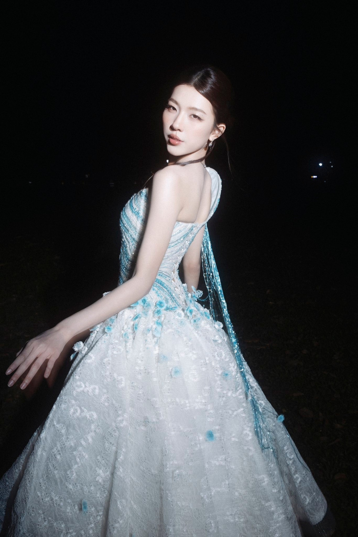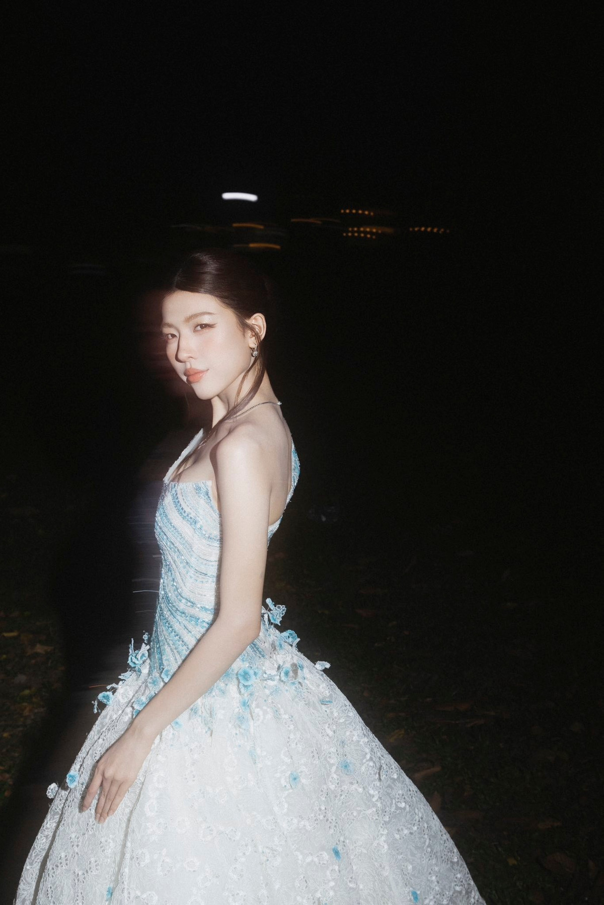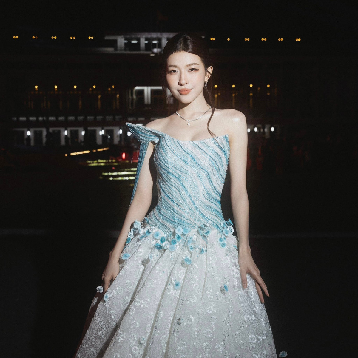 Điểm nhấn lớn nhất trong lần xuất hiện này của LAMOON thuộc về bộ trang phục. Váy dạ hội xanh – trắng được đính kết tỉ mỉ, mô phỏng ánh sóng biển, mang đến cảm giác mềm mại, bay bổng.