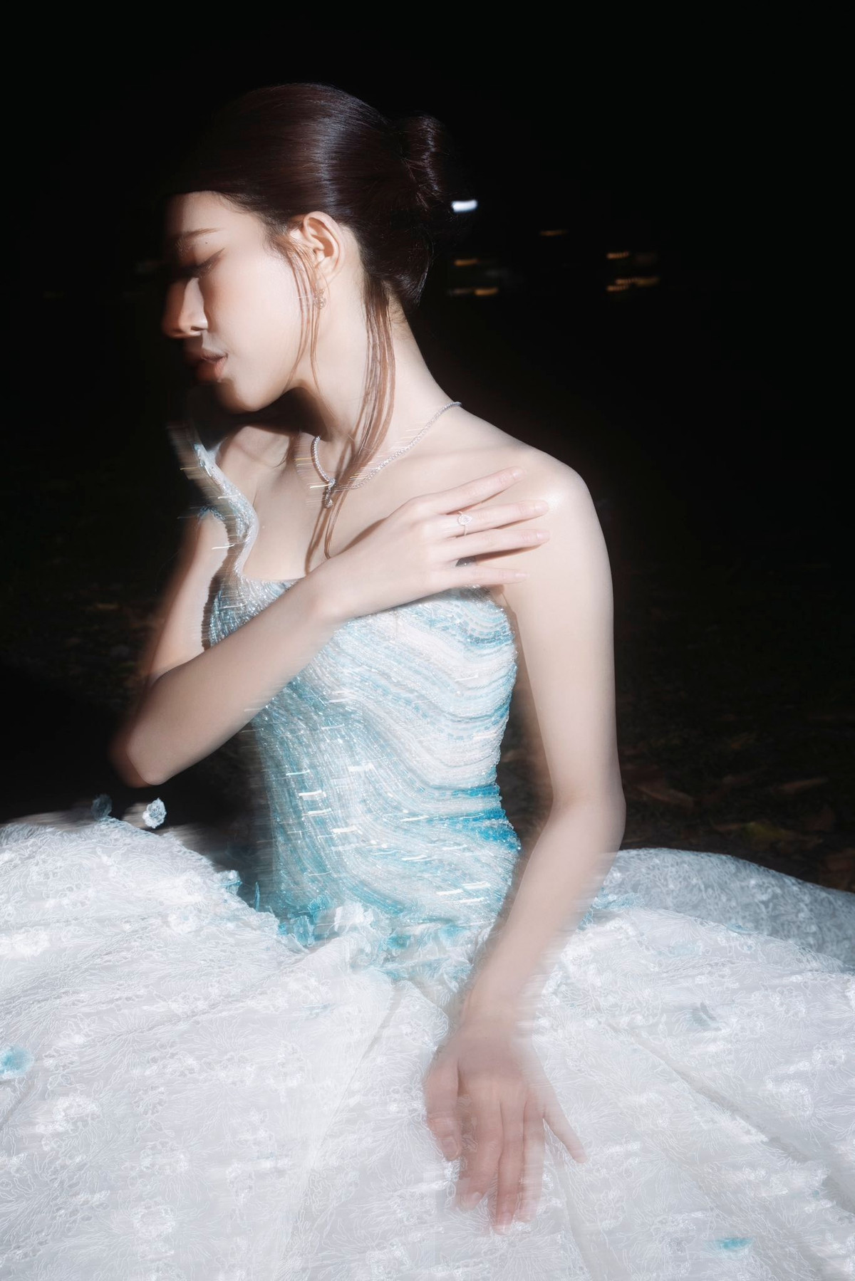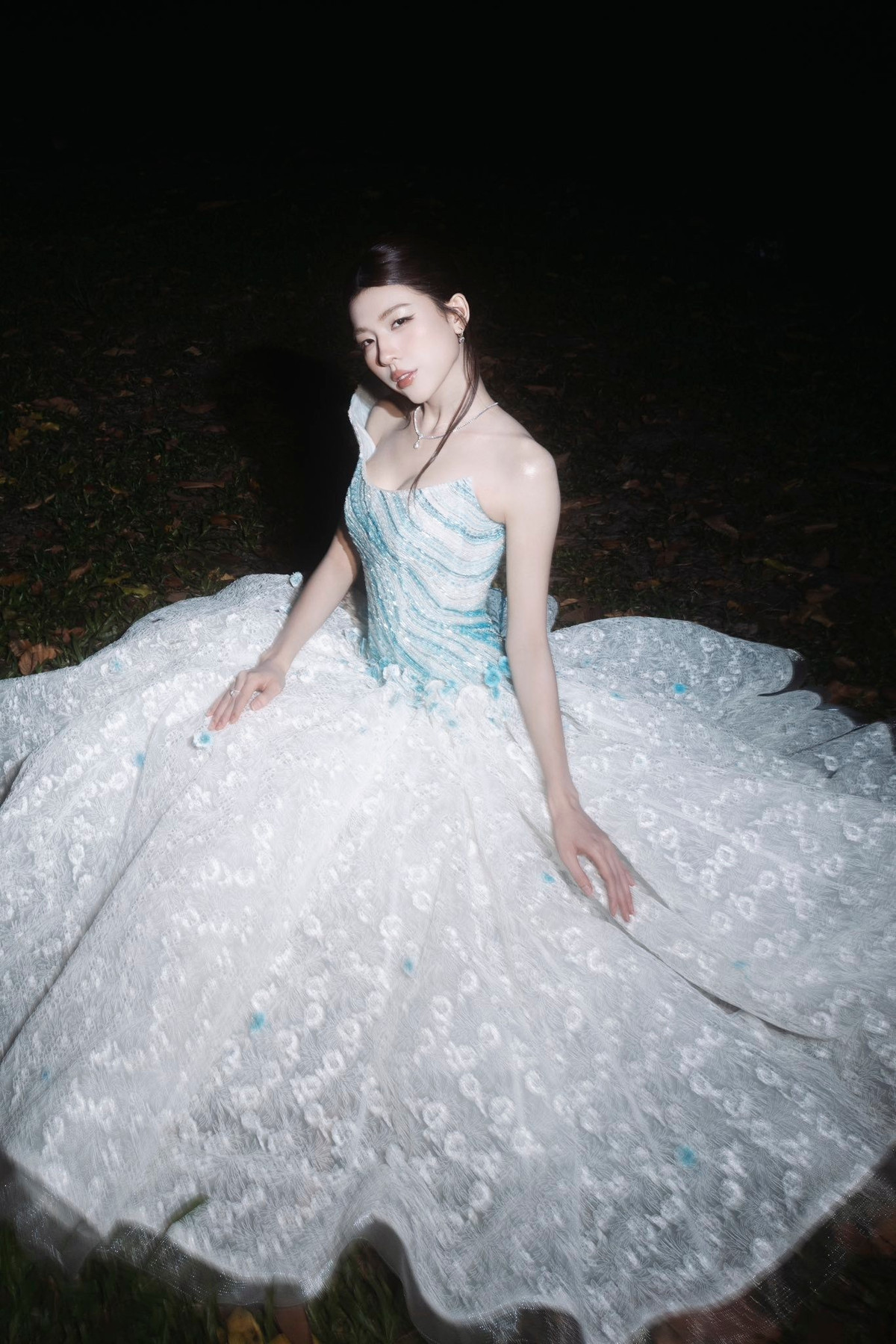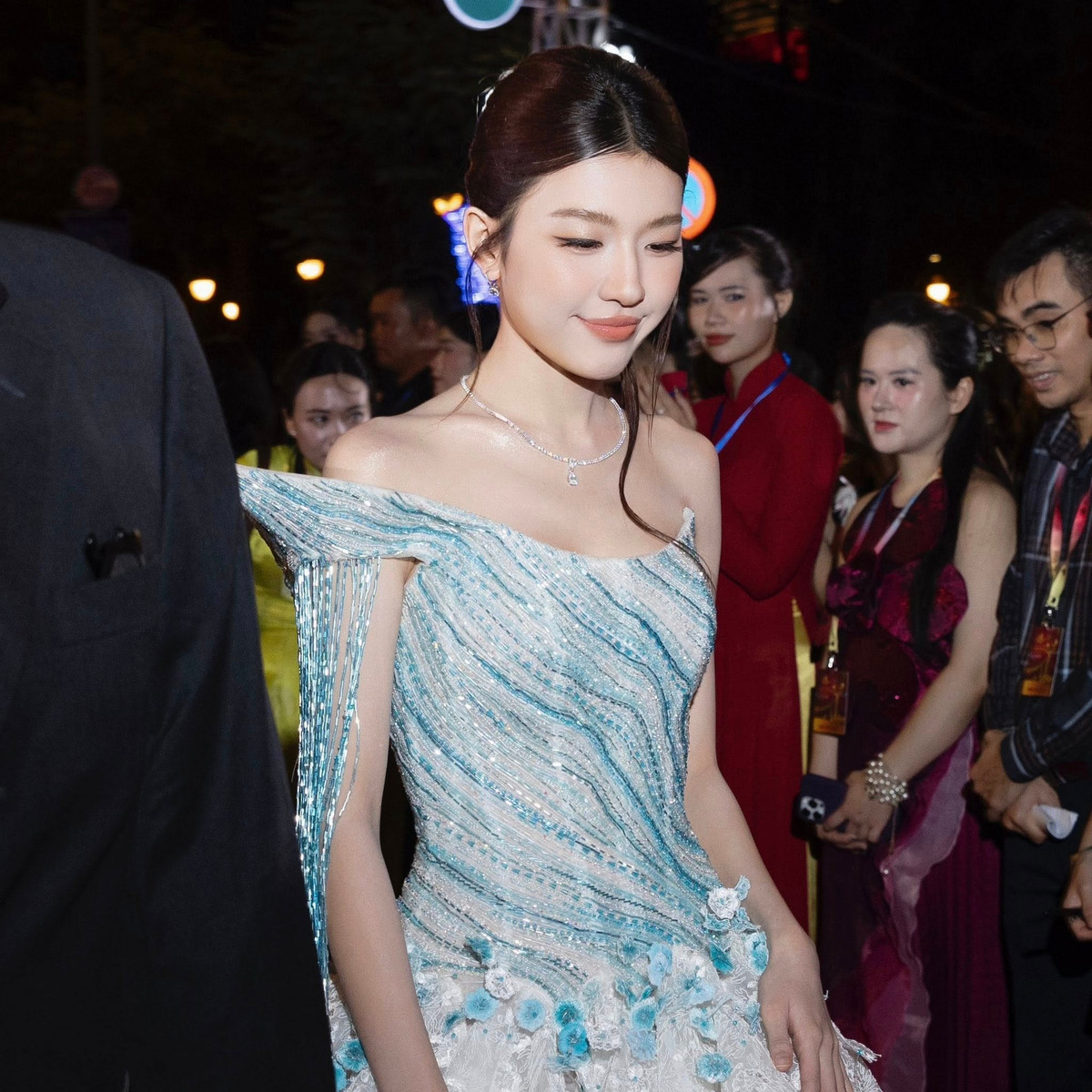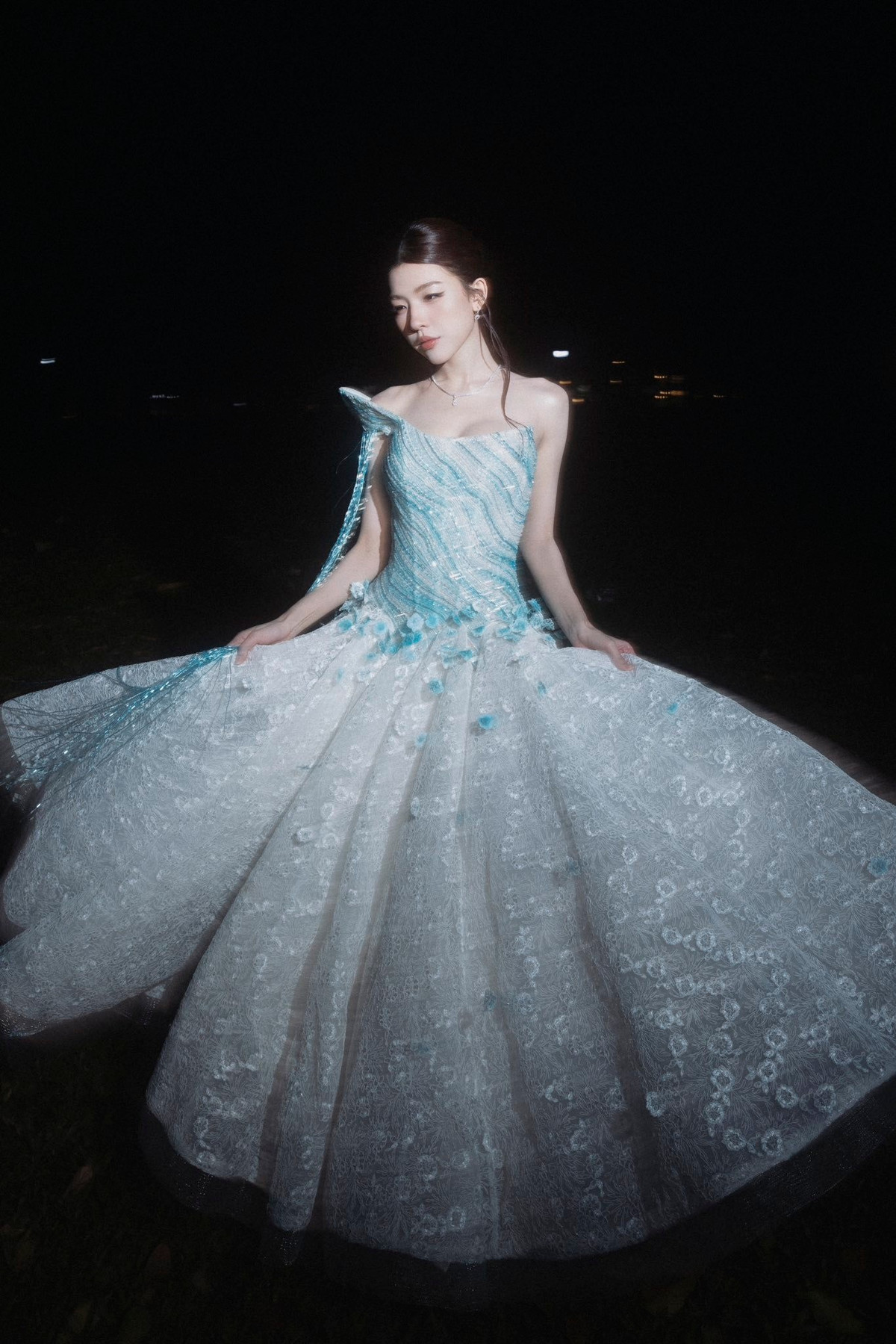 Điểm nhấn lớn nhất trong lần xuất hiện này của LAMOON thuộc về bộ trang phục. Váy dạ hội xanh – trắng được đính kết tỉ mỉ, mô phỏng ánh sóng biển, mang đến cảm giác mềm mại, bay bổng.