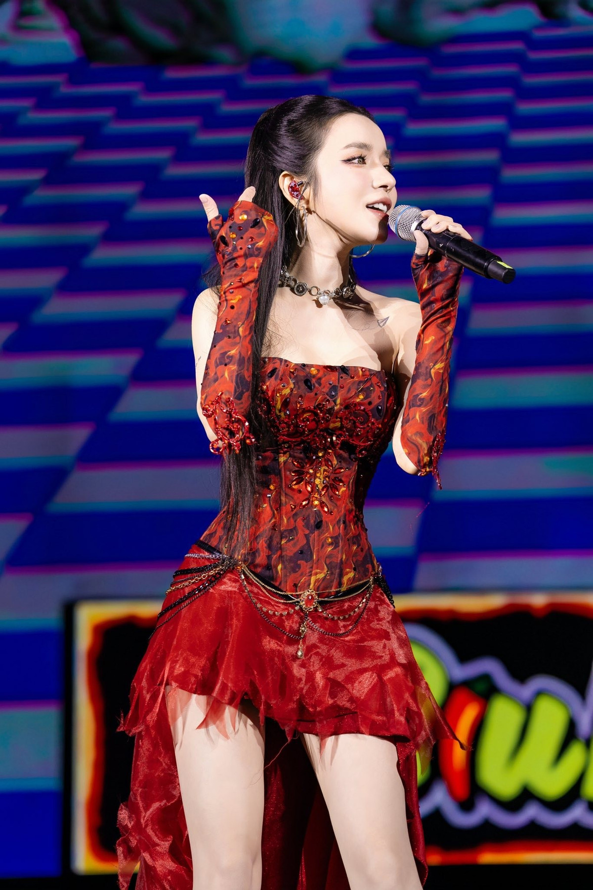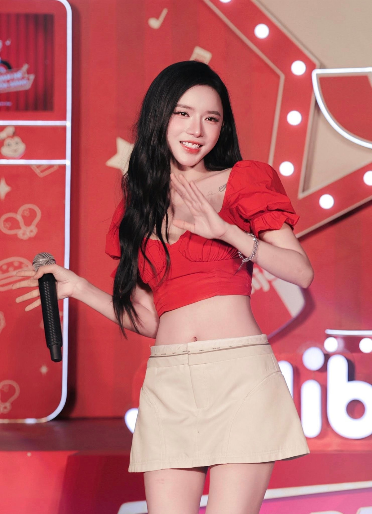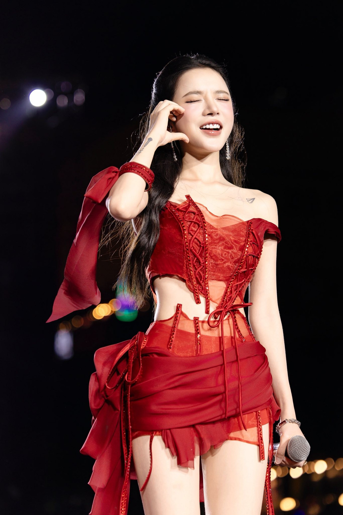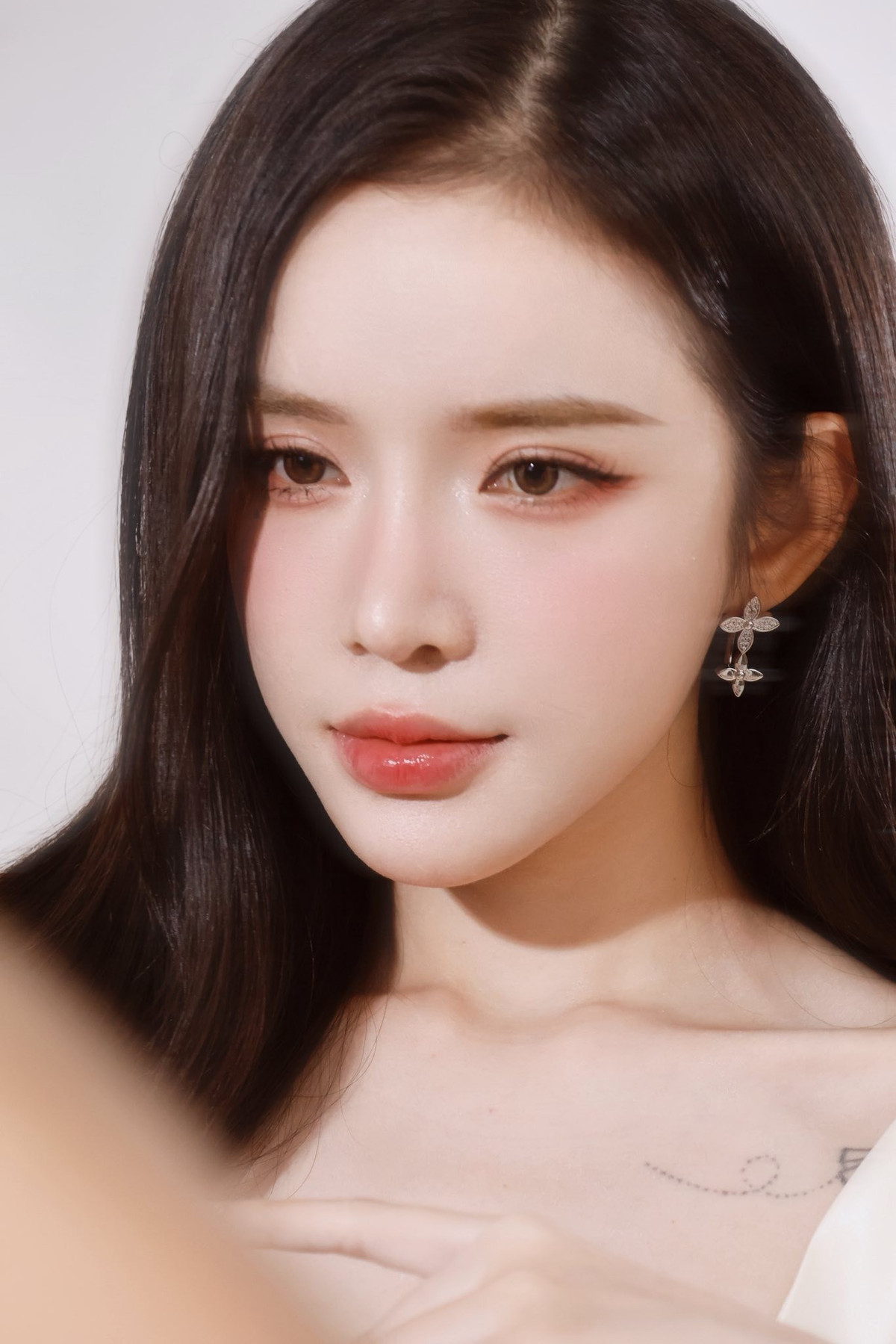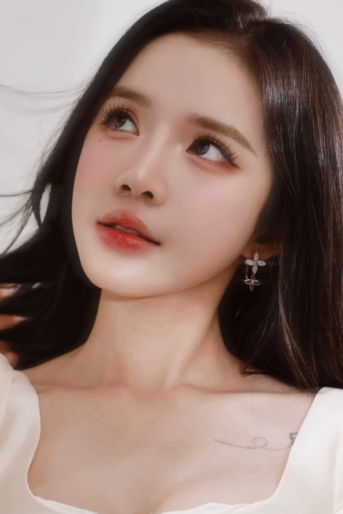 Không chỉ gây ấn tượng với gương mặt đẹp, Lyly còn khéo léo tạo điểm nhấn bằng đôi hoa tai hình hoa lấp lánh và để lộ khéo léo hình xăm nhỏ xinh trên xương quai xanh, tăng thêm phần tinh tế và quyến rũ.