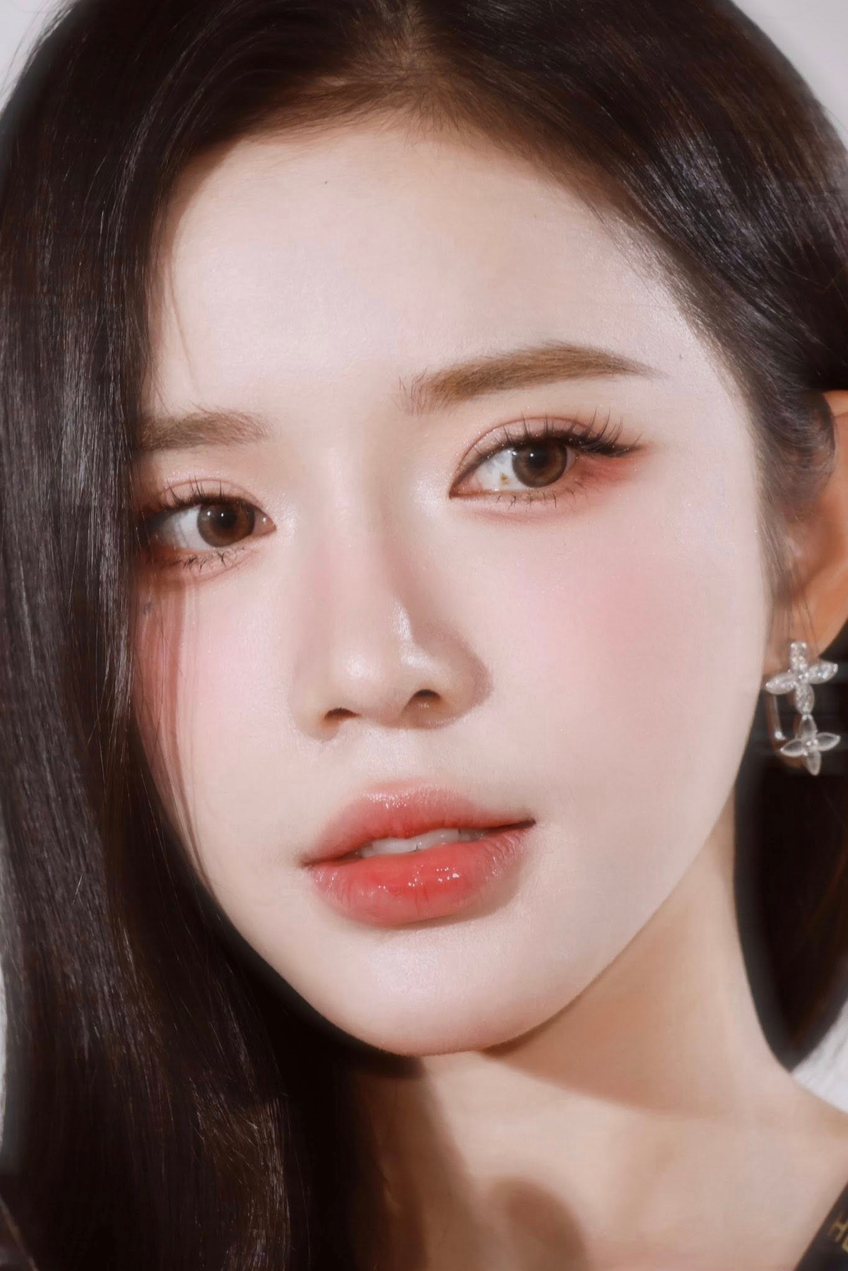 Lyly chọn tông màu cam đào và hồng phớt nhẹ nhàng cho phần mắt và má, kết hợp với đôi môi căng mọng được tô son bóng, tạo nên một tổng thể hài hòa, ngọt ngào và đầy cuốn hút.