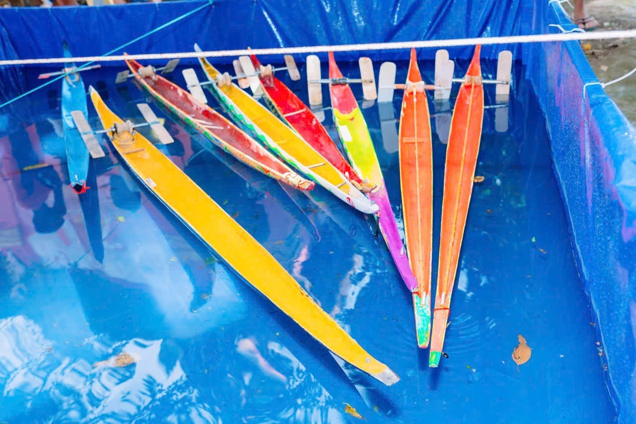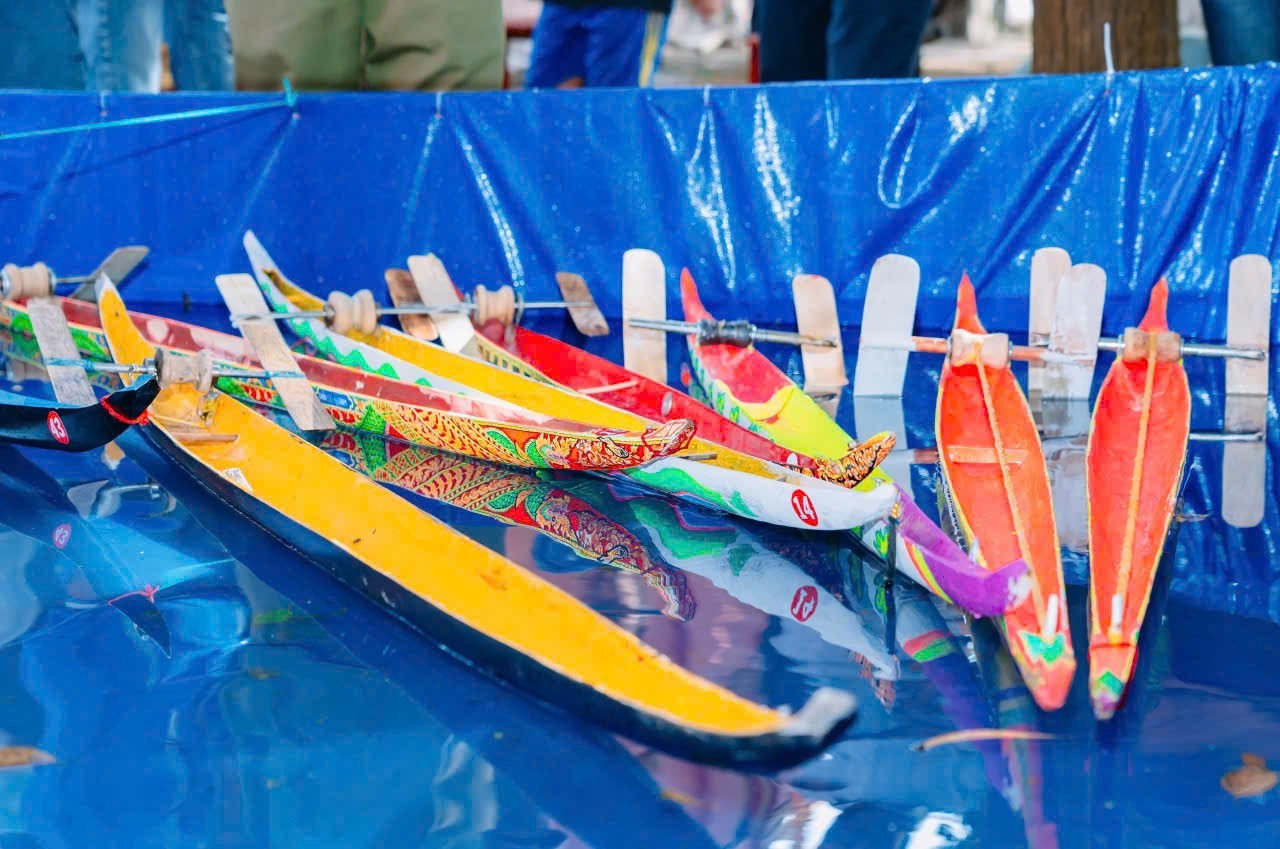 Những chiếc ghe mini được trang trí rực rỡ, mang đậm dấu ấn văn hóa Khmer với họa tiết truyền thống, màu sắc tươi sáng.