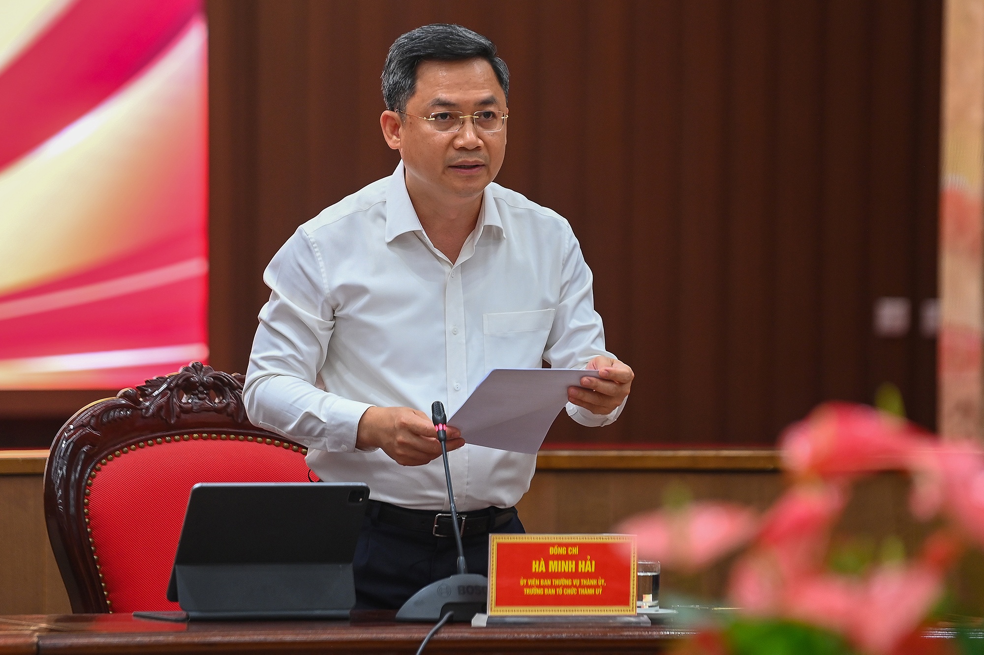 Trưởng ban Tổ chức Thành ủy Hà Nội Hà Minh Hải trao đổi tại buổi họp báo