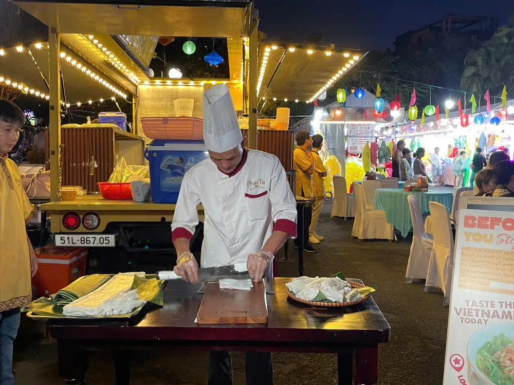 Phở Phát Tài mang đến trải nghiệm độc đáo với mô hình xe phở Mobile phục vụ riêng cho sự kiện, mang đến cho thực khách những tô phở bò, phở gà nóng hổi tại chỗ. Bếp trưởng của thương hiệu cũng trực tiếp trình diễn kỹ thuật thái phở bằng tay - phương pháp truyền thống thu hút đông đảo du khách dừng lại theo dõi.