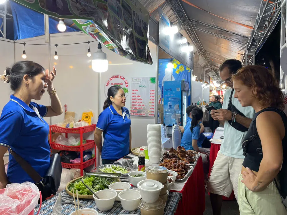 Tại khu gian hàng, các món như bún mắm, phở Bắc, bánh canh và bánh tằm thu hút đông đảo du khách nhờ hương thơm lan tỏa. Một số du khách cho biết họ ấn tượng với sự đa dạng của các món làm từ sợi gạo. Bên cạnh đó, cách trình bày món ăn cũng rất chỉn chu, sạch sẽ.