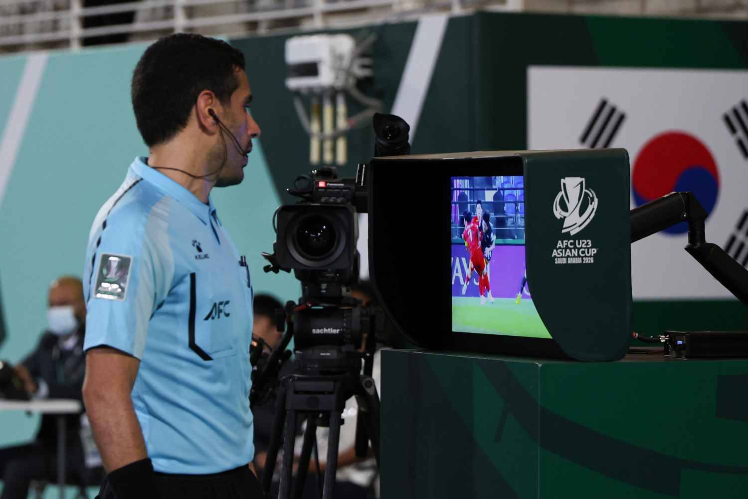 Trọng tài Abdullah Jamali (người Kuwait) xem VAR để thay đổi quyết định không thổi phạt đền cho U23 Hàn Quốc. ẢNH: AFC
