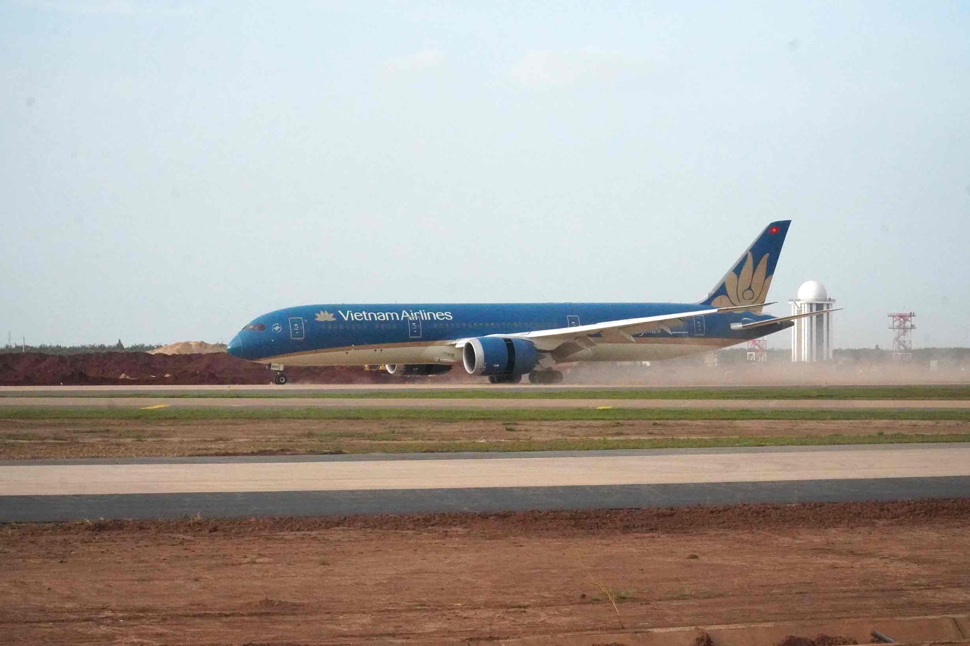 Máy bay Boeing 787 của Vietnam Airlines thực hiện chuyến bay kỹ thuật hạ cánh xuống sân bay Long Thành. Ảnh: Nghiêm Ý
