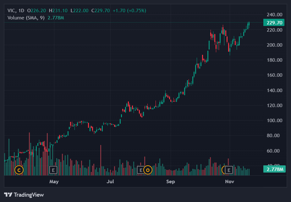 Kết thúc phiên 21/11, cổ phiếu VIC khép lại tuần giao dịch với chuỗi 5 phiên tăng liên tiếp, tổng cộng gần 9%, đóng cửa tại mức đỉnh lịch sử 229.700 đồng/cổ phiếu. Đà tăng bền bỉ này đã đẩy vốn hóa của tập đoàn tư nhân lớn nhất Việt Nam lên hơn 885.000 tỷ đồng, tức tăng ròng 72.000 tỷ chỉ trong một tuần.