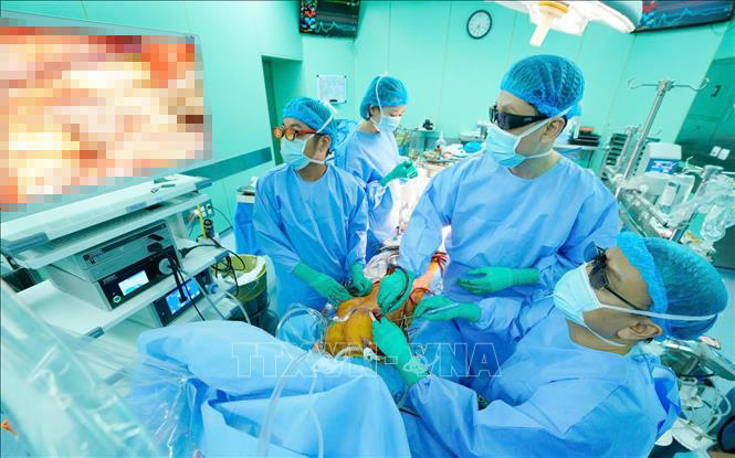 Các bác sĩ Bệnh viện Đại học Y dược Thành phố Hồ Chí Minh thực hiện phẫu thuật nội soi 3D thay van động mạch chủ kết hợp bắc cầu mạch vành. Ảnh: TTXVN phát
