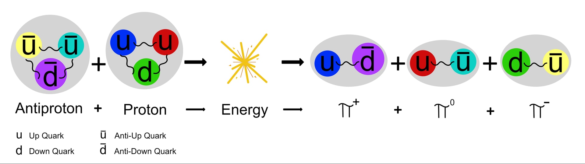 Khi một proton đập vào một phản proton thì quá trình phá hủy sẽ diễn ra ở cấp độ quark khi các phản quark triệt tiêu ra năng lượng và có thể chuyển hóa thành các hạt meson