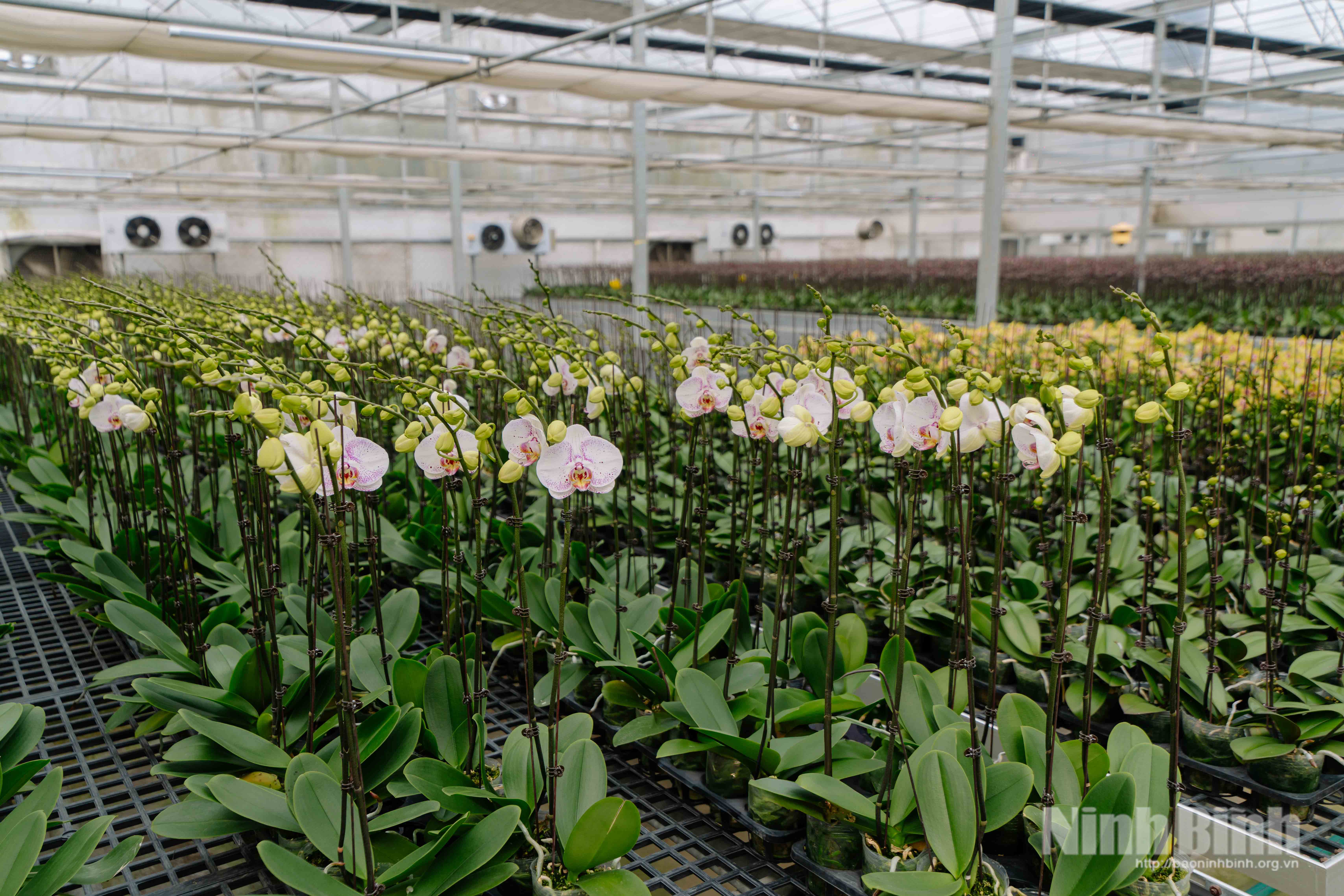 Những giàn lan được trồng trong nhà kính chuyên dụng, nơi khí hậu, độ ẩm và ánh sáng đều được điều chỉnh tự động. Nhờ đó, lan hồ điệp giữ được độ bền của hoa từ 2-4 tháng, khác biệt rõ rệt so với lan trồng truyền thống, vốn phụ thuộc nhiều vào thời tiết tự nhiên.