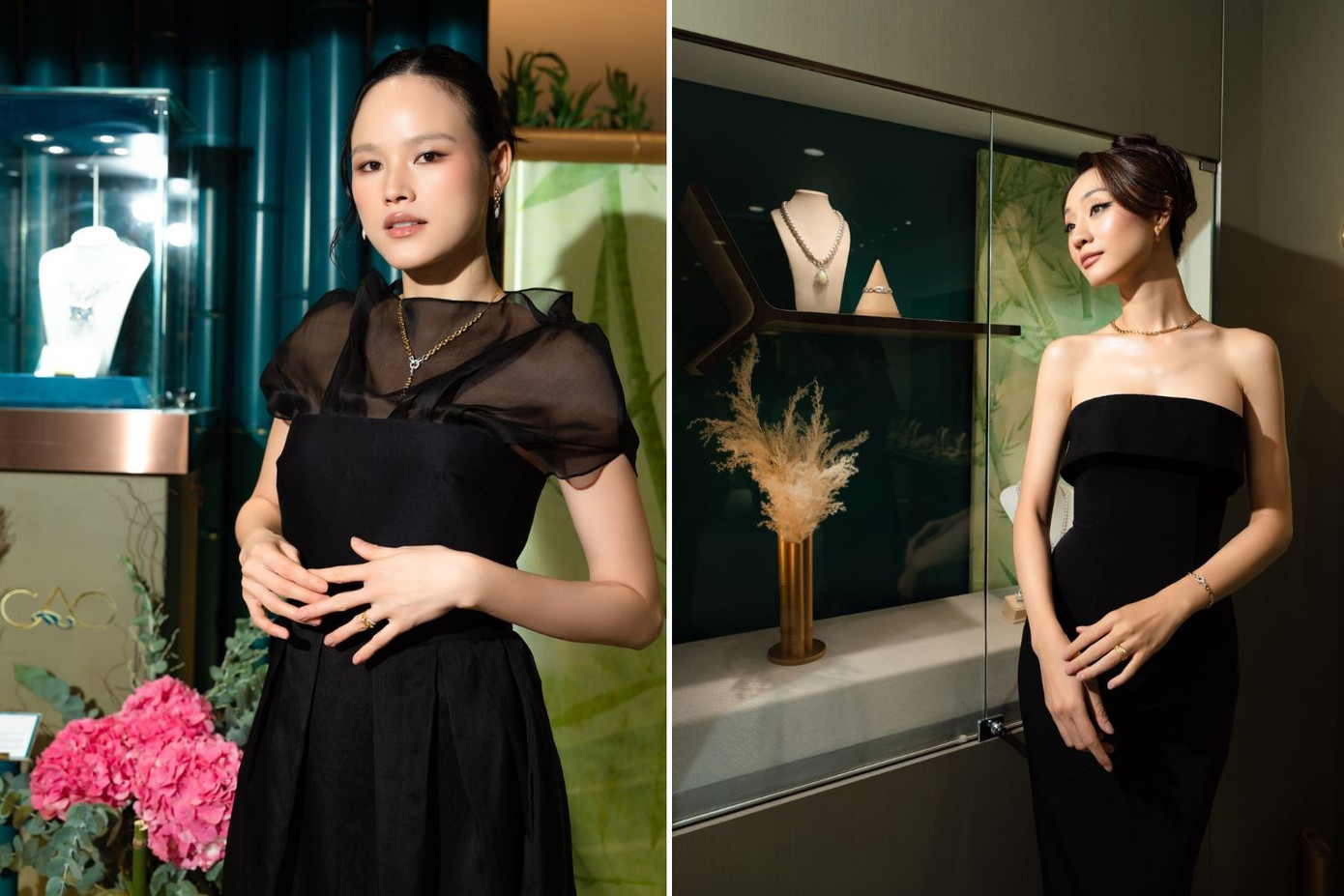 Sánh đôi cùng siêu mẫu Lan Khuê, còn có siêu mẫu Tuyết Lan và người đẹp Trà My. Hai người đẹp cùng diện váy đen huyền bí và sang trọng: Tuyết Lan mang đến layout high-fashion với chiếc đầm cocktail thiết kế cầu kỳ, Trà My hóa thân thành một quý cô trang nhã, thanh lịch, tóc búi gọn.