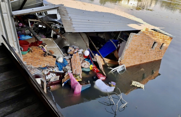 Trước đó chiều tối 8/2, hai căn nhà có kết cấu tường gạch, mái tôn, sàn gỗ có diện tích mỗi căn khoảng 20m2 nằm sát mé kênh Xáng bất ngờ đổ sập xuống kênh.