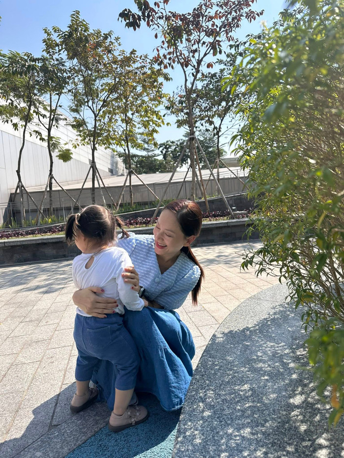 Lan Phương khoe dáng thon gọn, cùng con tận hưởng khoảnh khắc đáng nhớ. (Ảnh FBNV)