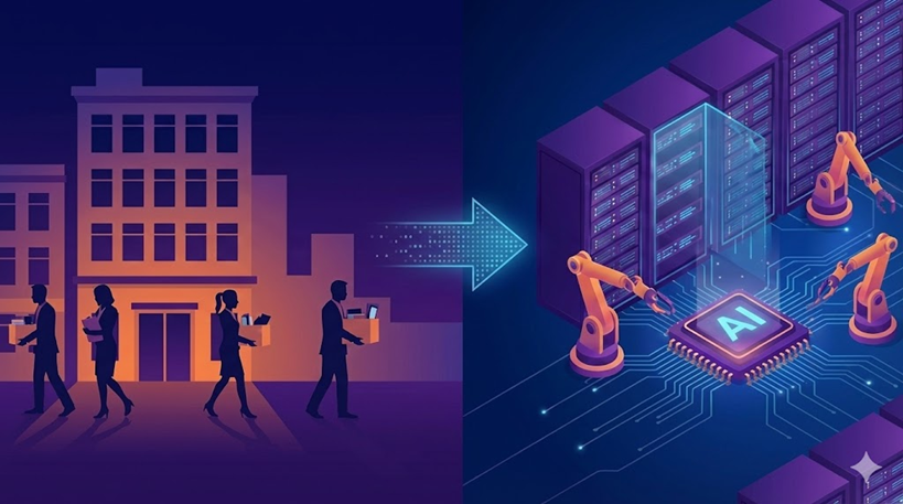 Các doanh nghiệp đang cắt giảm nhân sự ở các mảng vận hành cũ để dồn nguồn lực đầu tư mạnh mẽ vào trung tâm dữ liệu và công nghệ AI - Ảnh: Gemini