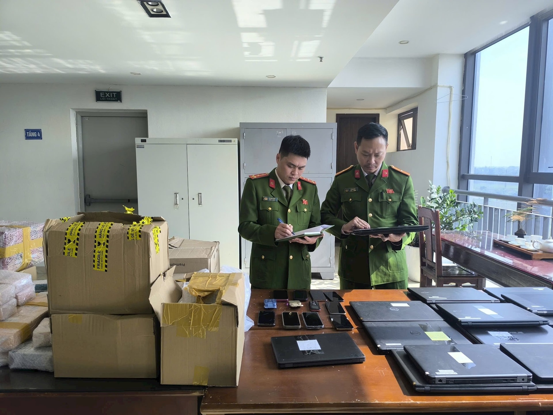 Tại hiện trường, hàng loạt máy tính xách tay, điện thoại bàn và bảng thống kê doanh thu "khủng" đã bị thu giữ, phơi bày một quy trình lừa đảo khép kín và chuyên nghiệp.
