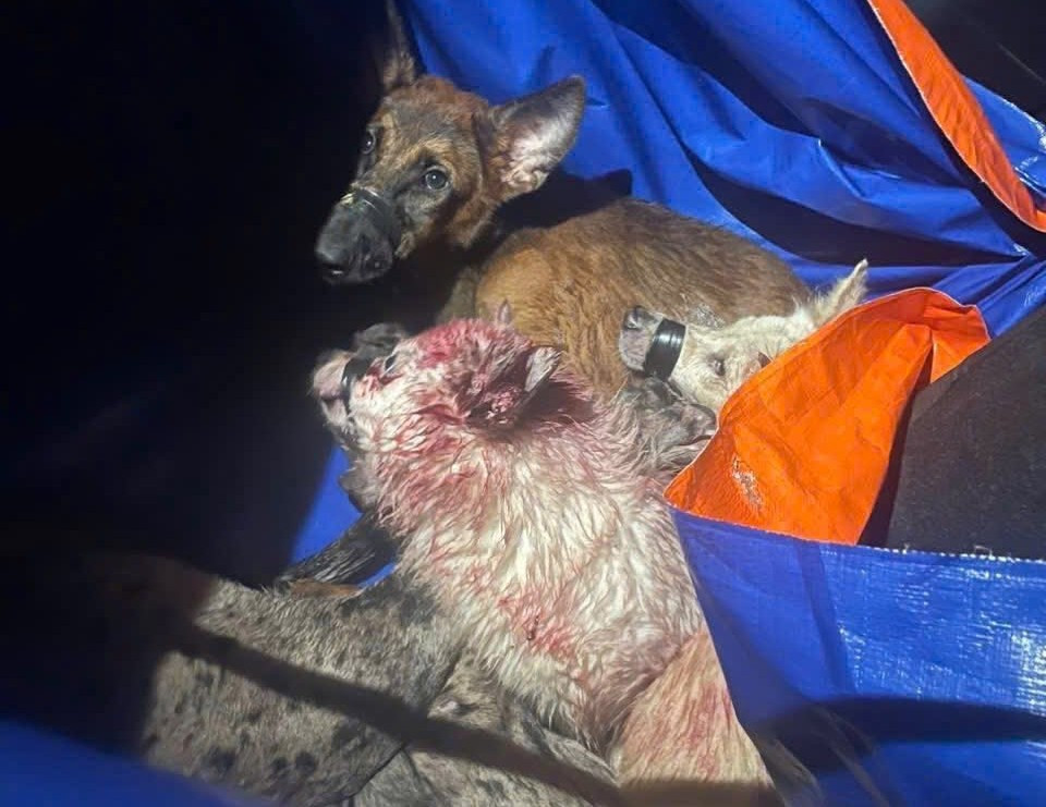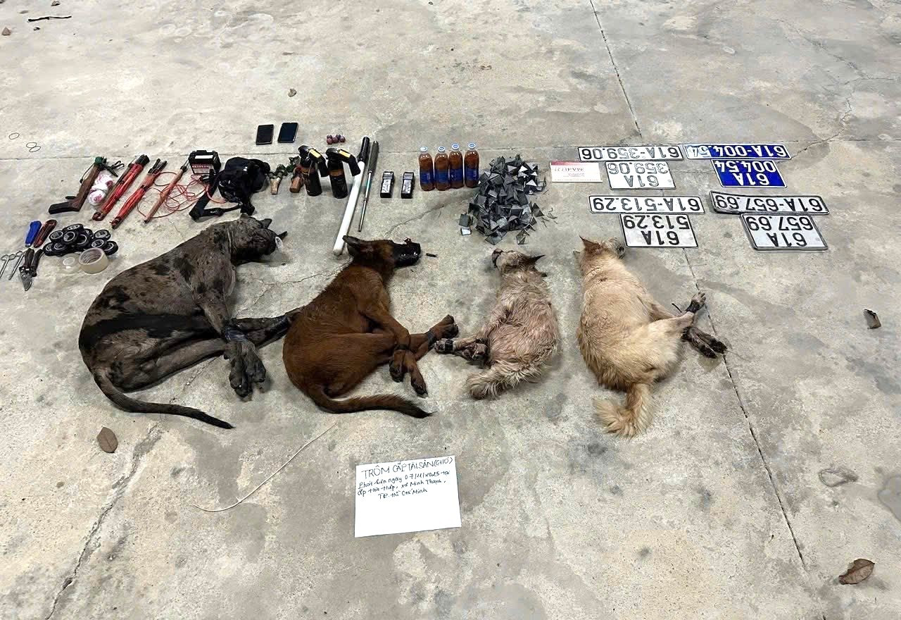 Qua kiểm tra nhanh trên ô tô, công an phát hiện có bình xịt hơi cay, súng điện, nhiều mảnh thép hình thoi (loại các đối tượng thường dùng để rải giữa đường cản địa khi bị người khác đuổi theo - PV), nhiều biển số xe cả xanh và trắng, ớt bột và nhiều con chó bị trói.