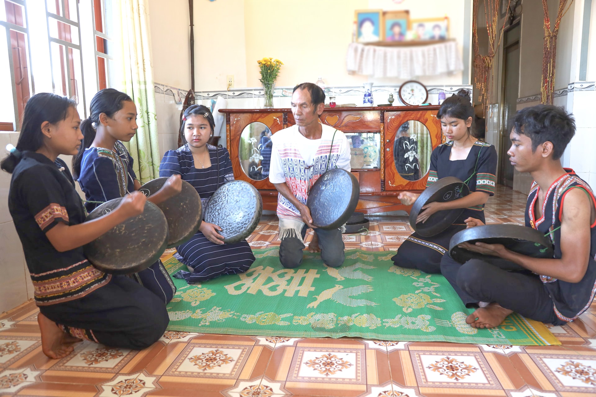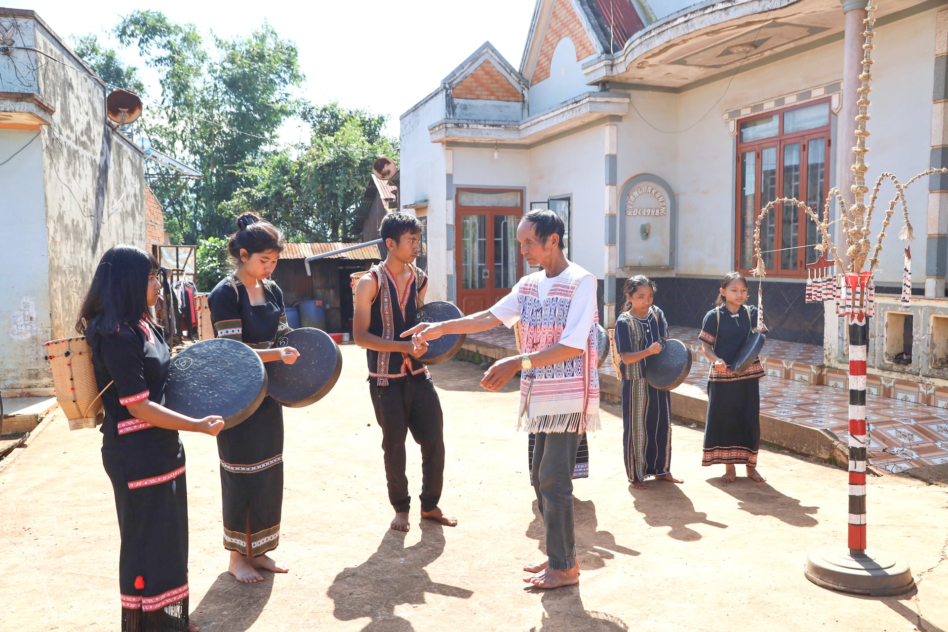 Những buổi chiều cuối tuần, căn nhà nhỏ của già làng lại rộn ràng tiếng cồng chiêng. Dưới sự hướng dẫn kiên nhẫn của già K’ Tiếu, các em nhỏ, thanh thiếu niên chăm chú lắng nghe, tập gõ từng nhịp chiêng sao cho đúng, cho đều.
