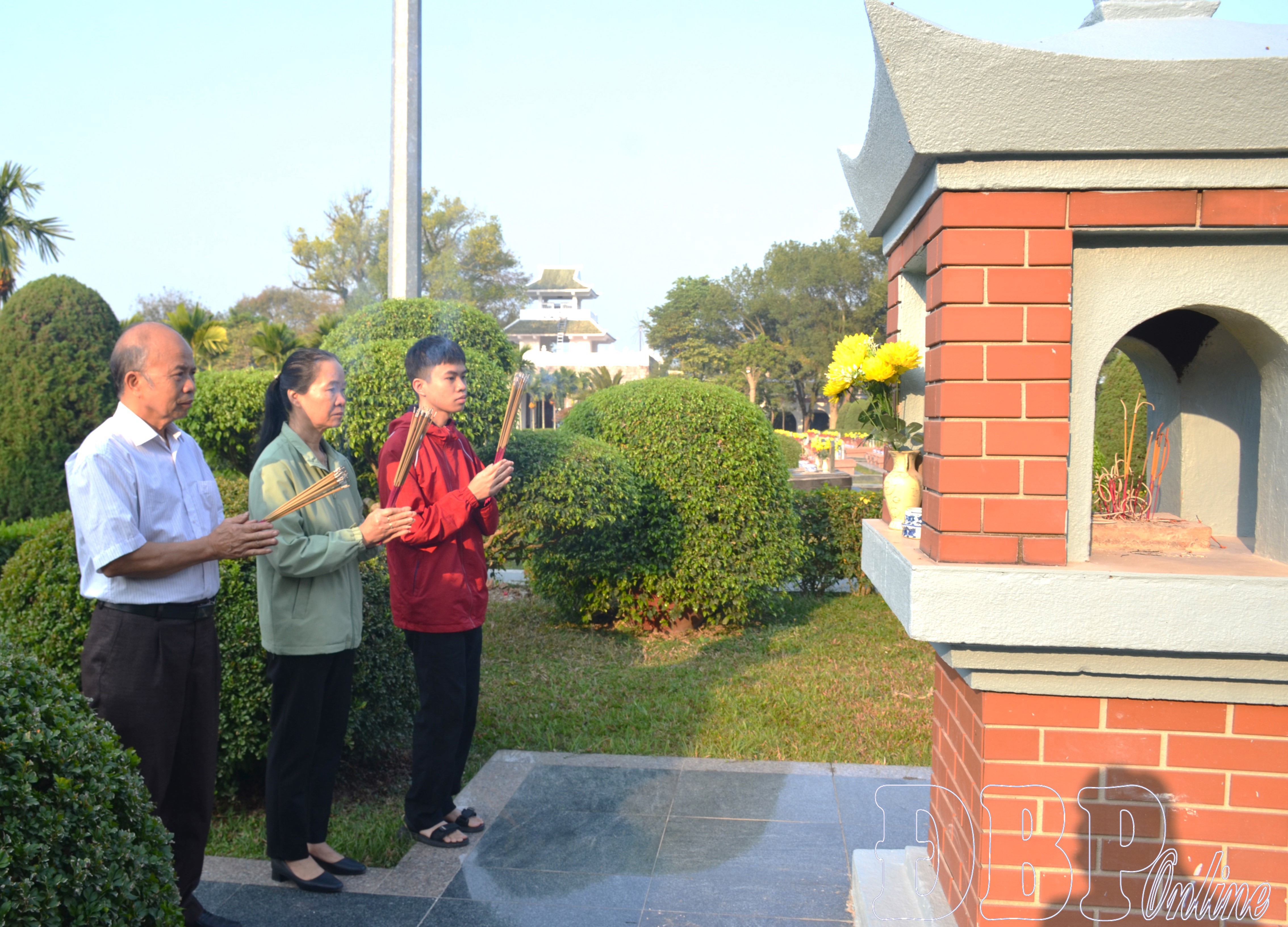 Cách đó không xa, gia đình bà Nguyễn Thị Thanh Thủy, người dân tổ dân phố 11 (phường Điện Biên Phủ) cũng có mặt tại Nghĩa trang Liệt sĩ quốc gia A1, thành kính dâng hương tri ân các anh hùng liệt sĩ đã chiến đấu quên mình vì nền độc lập, tự do của Tổ quốc. Nhiều năm nay, việc đến nghĩa trang vào ngày đầu năm đã trở thành thông lệ không thể thiếu của gia đình. Sau khi ra khỏi nhà đầu năm, thay vì đi du xuân hay chúc tết người thân, cả gia đình bà Thủy cùng nhau chuẩn bị những nén nhang thơm đến thắp hương tưởng niệm các liệt sĩ.