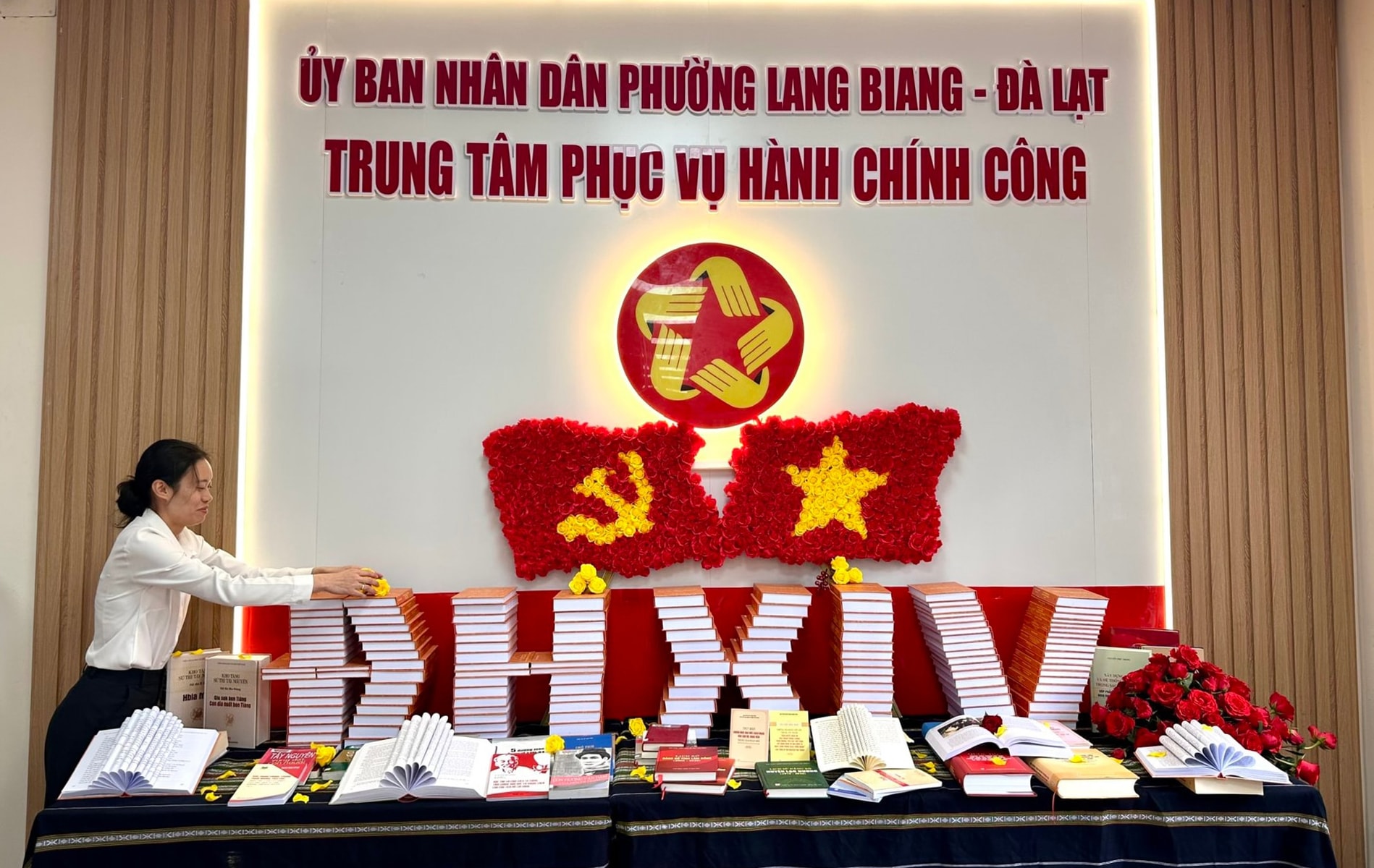 Không gian tuyên truyền được bố trí trang trọng, khoa học với hệ thống panô, áp phích, hình ảnh, tài liệu trực quan, sinh động. Từ những cuốn sách xếp thành dòng chữ viết tắt “ĐẠI HỘI XIV - ĐH XIV”, đến mô hình cờ Đảng và cờ Tổ quốc được tạo hình từ hoa hồng - loài hoa mang tính biểu tượng, gắn liền với bản sắc văn hóa của vùng đất Lang Biang, tạo nên hình ảnh trang trọng, giàu cảm xúc, biểu trưng cho lý tưởng cách mạng, tinh thần yêu nước và niềm tin son sắt của Nhân dân đối với Đảng và Tổ quốc.