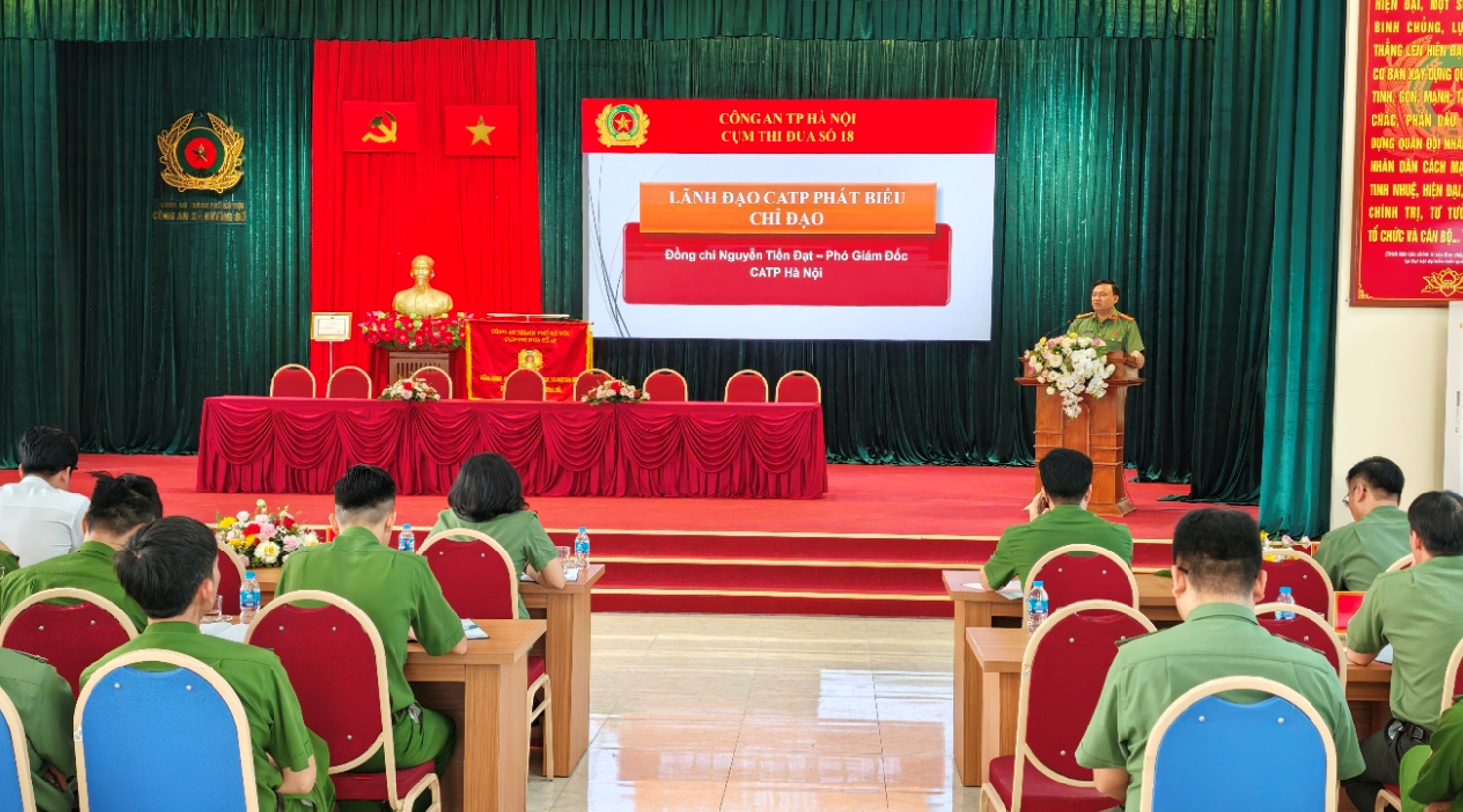 Đại tá Nguyễn Tiến Đạt - Ủy viên Ban Thường vụ Đảng ủy, Phó Giám đốc Công an thành phố Hà Nội ghi nhận sự chuẩn bị nghiêm túc của Cụm thi đua số 18, đồng thời yêu cầu các đơn vị nhanh chóng cụ thể hóa nội dung thi đua, triển khai thực chất, tránh hình thức; lấy hiệu quả công tác làm thước đo đánh giá cán bộ.