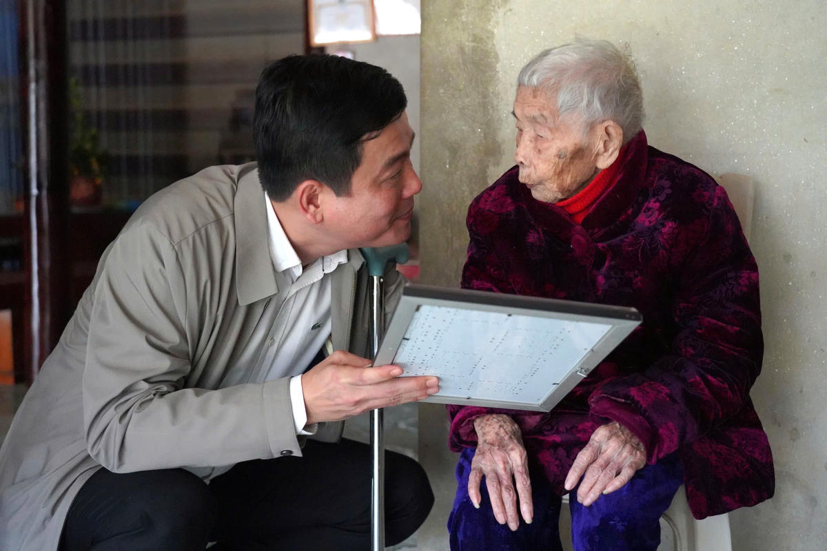 Ông Nguyễn Thành Đồng - Ủy viên Ban Thường vụ Tỉnh ủy, Chủ tịch Ủy ban MTTQ Việt Nam chúc thọ cụ Trần Quốc Tuệ (SN 1936, trú thôn An Sú, xã Sơn Kim 1, tỉnh Hà Tĩnh). Ảnh: HN.