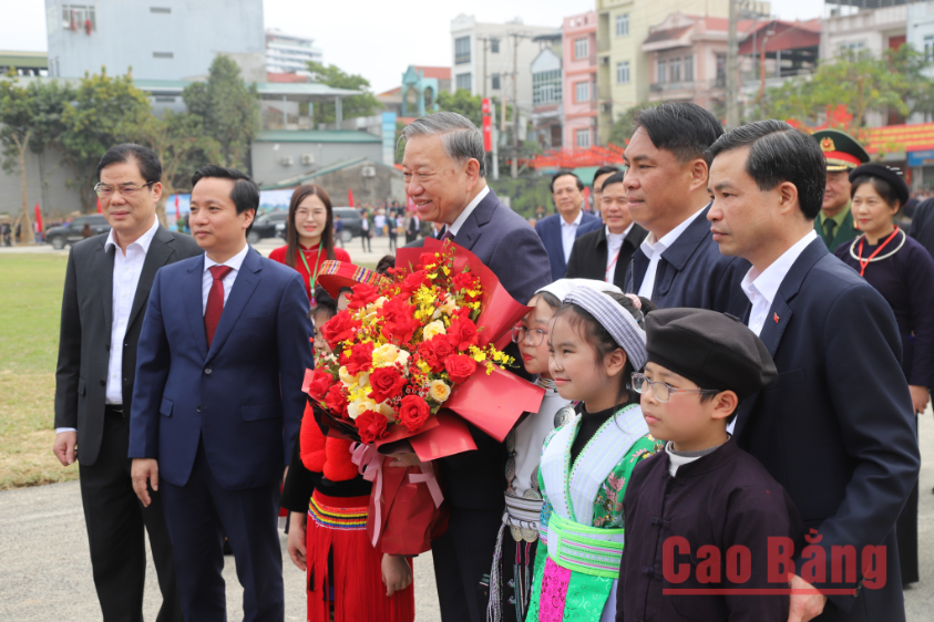 Tổng Bí thư Tô Lâm nhận hoa chào mừng từ thiếu nhi các dân tộc Cao Bằng.