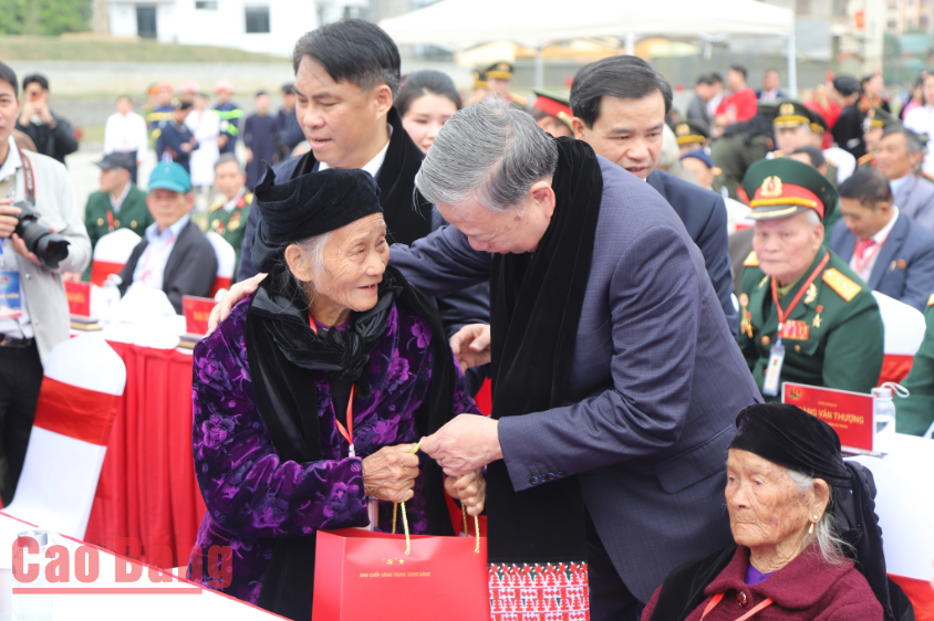 Tổng Bí thư Tô Lâm trao tặng các phần quà cho Đảng bộ và nhân dân tỉnh Cao Bằng, thể hiện sự quan tâm của Trung ương đối với địa phương.
