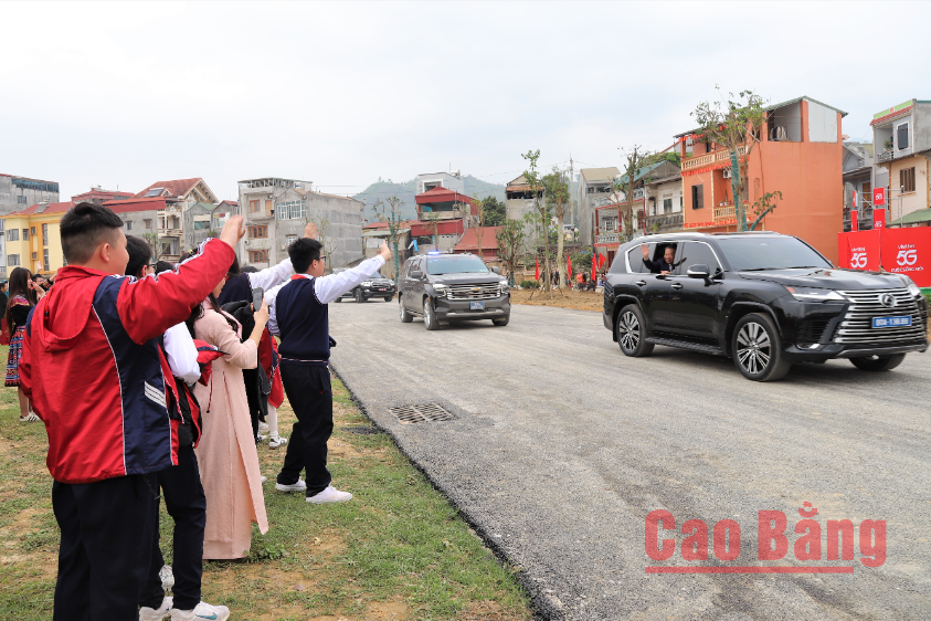 Những cánh tay và nụ cười rạng rỡ của học sinh, nhân dân Cao Bằng vẫy chào tạm biệt Tổng Bí thư Tô Lâm rời địa điểm buổi gặp mặt.