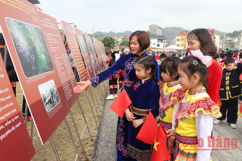 Qua không gian trưng bày tư liệu, hình ảnh tại sự kiện, cô giáo hướng dẫn các em học sinh tìm hiểu lịch sử cách mạng, bồi đắp niềm tự hào và ý thức trách nhiệm của thế hệ trẻ.