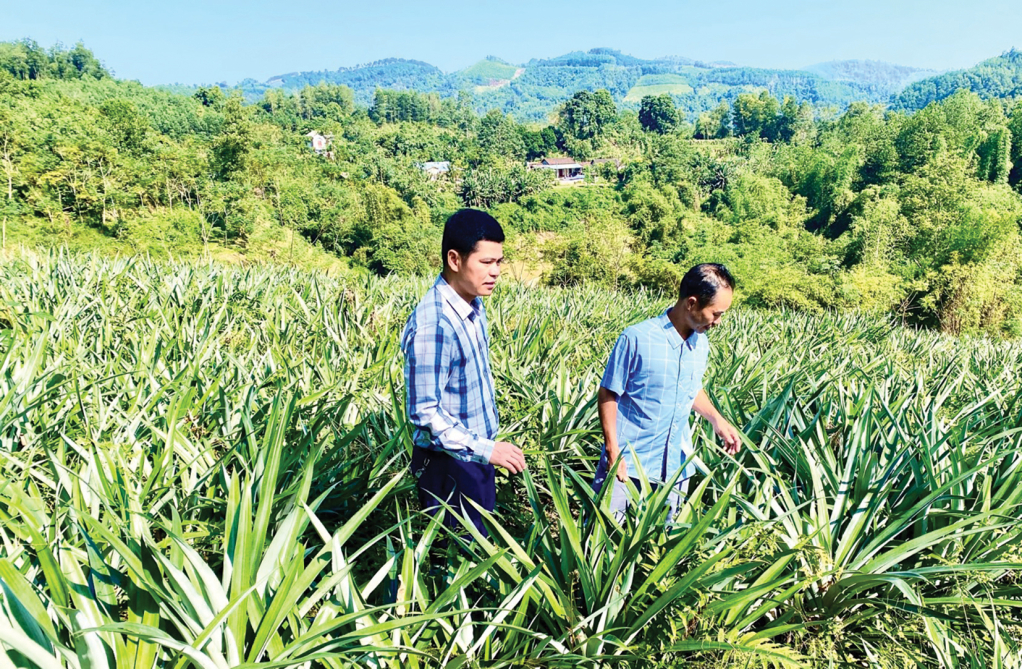 Chủ tịch UBND xã Bạch Đằng Lý Minh Sơn (bên trái) thăm đồi dứa của các hộ dân trong xã.