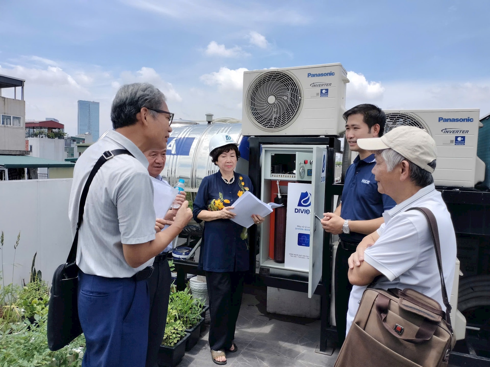 Hội đồng giám khảo Hội thi khảo sát máy xử lý nước ứng dụng công nghệ pin điện hóa DIVION (đề tài dự thi của Trường Đại học Xây dựng Hà Nội) tại nhà một hộ dân ở phường Tây Hồ, Hà Nội.