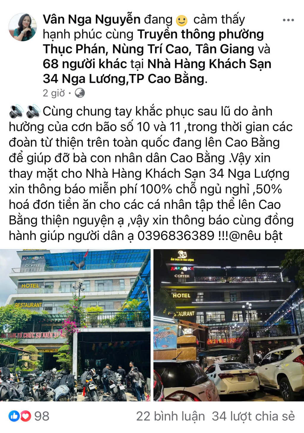 Tiêu biểu trong phong trào này là Nhà hàng - Khách sạn 34 Nga Lượng, phường Thục Phán. Ngay sau khi tình hình mưa lũ ổn định, cơ sở phát đi thông báo miễn phí 100% chỗ ngủ, nghỉ và giảm 50% hóa đơn tiền ăn cho tất cả các cá nhân, tập thể và đoàn thiện nguyện lên Cao Bằng hỗ trợ đồng bào vùng bị thiệt hại. Đại diện khách sạn chia sẻ: Những ngày này, thấy nhiều đoàn thiện nguyện vượt đường xa, mang theo tấm lòng hướng về Cao Bằng, chúng tôi cảm nhận rõ tinh thần đoàn kết và nhân ái. Vì thế, muốn góp phần nhỏ bé của mình để cùng san sẻ khó khăn.