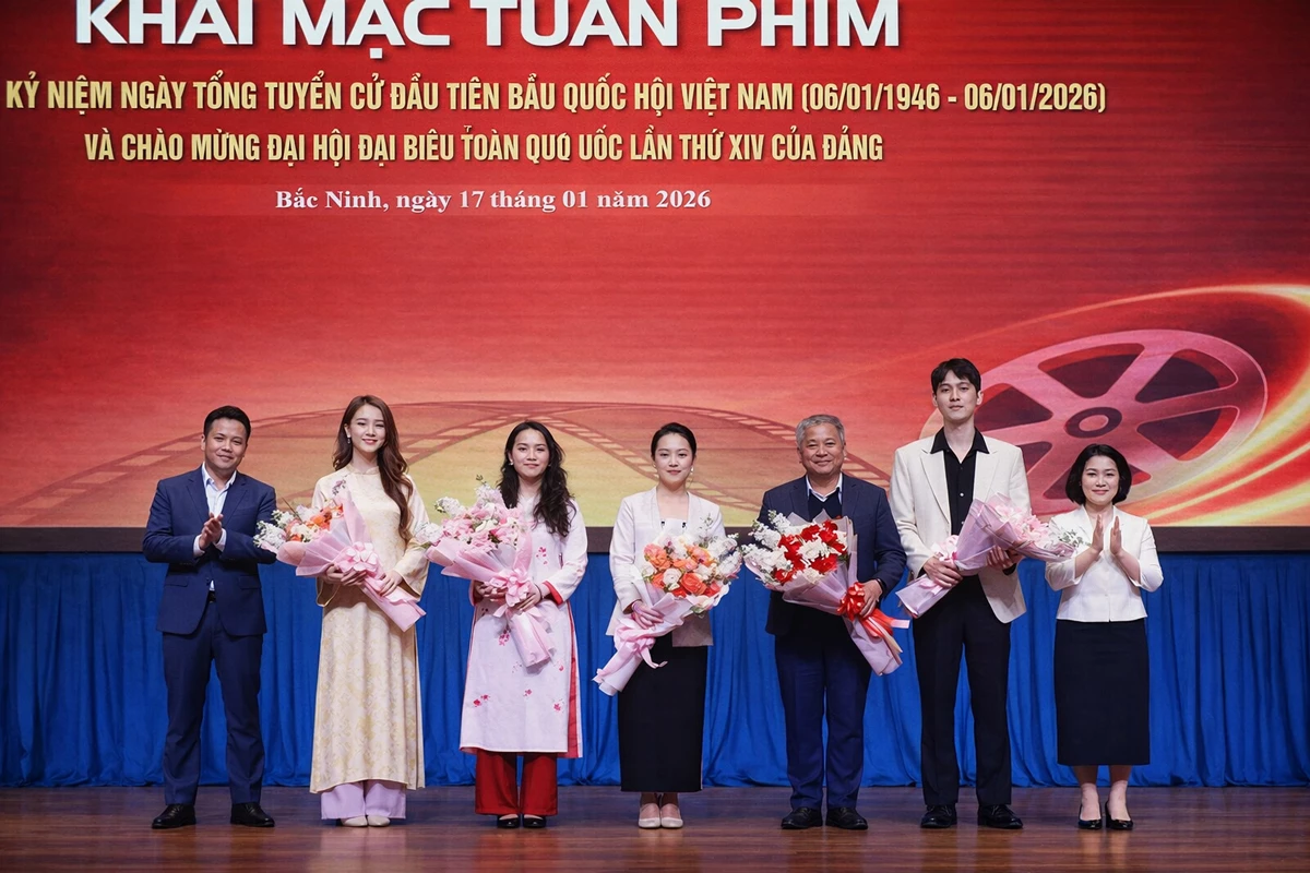 Đại diện Cục Điện ảnh (Bộ Văn hóa, Thể thao và Du Lịch) tặng hoa chúc mừng các đoàn làm phim được lựa chọn chiếu tại Tuần phim chào mừng Đại hội Đảng lần thứ XIV.