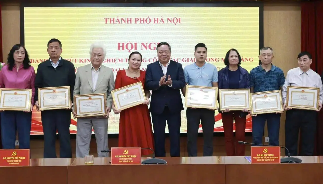 Phó Bí thư Thường trực Thành ủy Nguyễn Văn Phong trao Bằng khen của UBND TP và quà cho các cá nhân, hộ gia đình có thành tích trong giải phóng mặt bằng đường Vành đai 1 (đoạn Hoàng Cầu - Voi Phục), trong đó có bà Nguyễn Thị Dung - Tổ trưởng Tổ dân phố 53 (thứ 3 từ trái qua).