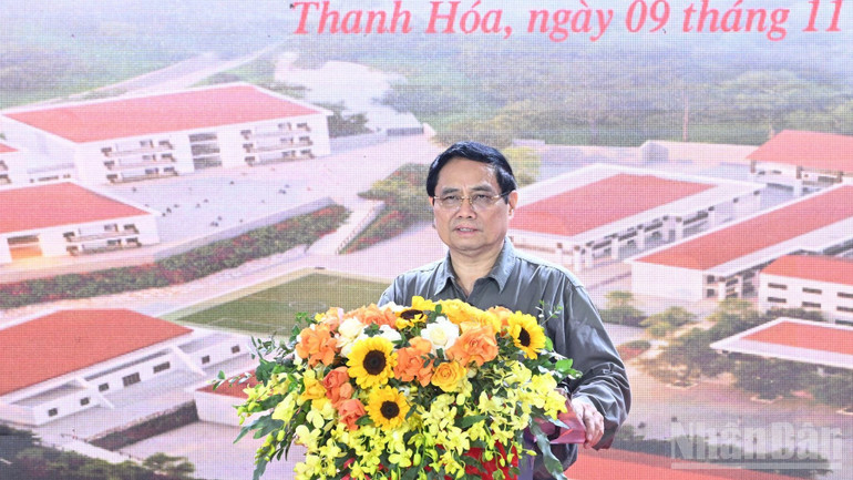 Từ điểm cầu chính Thanh Hóa, nhân dịp lễ khởi công và chào mừng Ngày Nhà giáo Việt Nam 20/11, thay mặt lãnh đạo Đảng, Nhà nước, Chính phủ, Thủ tướng gửi tới lãnh đạo các ban, bộ, ngành, địa phương, quý vị đại biểu cùng toàn thể các thầy cô giáo, các bậc phụ huynh và các em học sinh lời chào trân trọng, lời thăm hỏi ân cần và lời chúc mừng tốt đẹp nhất.