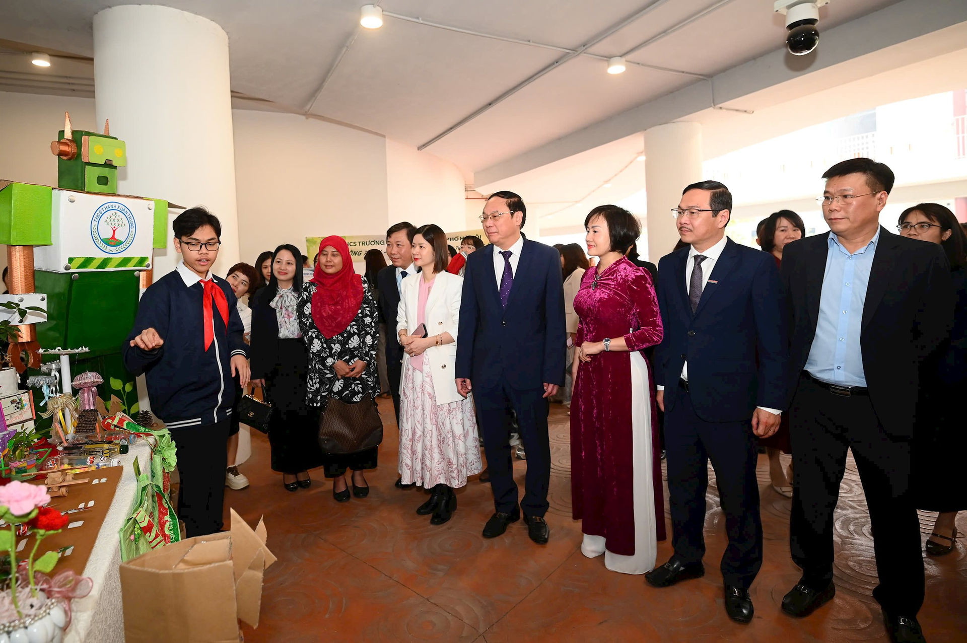 Các đại biểu tham quan mô hình, sáng kiến tiêu biểu về giảm rác thải nhựa do học sinh sáng tạo. Ảnh: N.Lộc