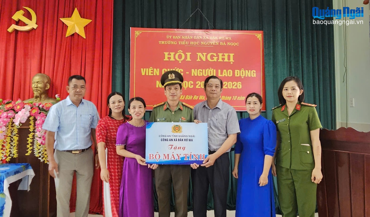 Cùng ngày, Công an xã Đăk Rơ Wa trao tặng 5 bộ máy vi tính cho các cơ sở giáo dục trên địa bàn xã, góp phần hỗ trợ nhà trường nâng cao chất lượng dạy và học, đáp ứng yêu cầu ứng dụng công nghệ thông tin trong giáo dục hiện nay.