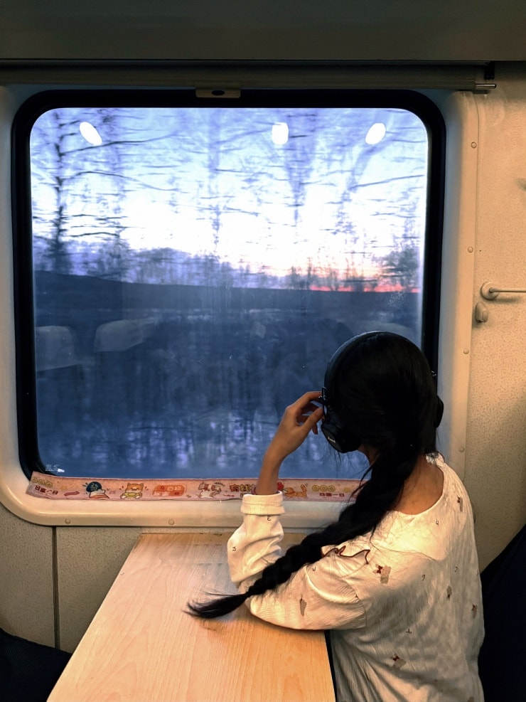 Hoàng Nga chia sẻ, trải nghiệm trên tàu khá đặc biệt khi có sự chênh lệch nhiệt độ lớn. Dù bên ngoài tuyết phủ trắng xóa và cửa sổ đông cứng, nhưng bên trong tàu lại rất nóng do hệ thống sưởi và lượng hành khách lớn, khiến không khí trở nên bí bách trong những giờ đầu.