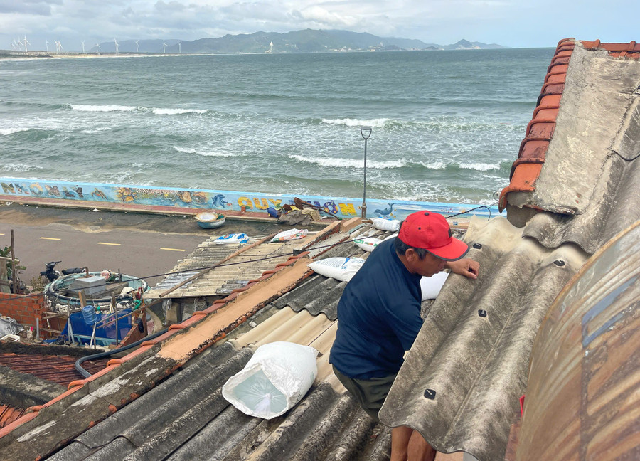 Người dân làng biển Nhơn Lý dùng bao cát dằn mái nhà để tránh gió bão. Ảnh: Ngọc Nhuận