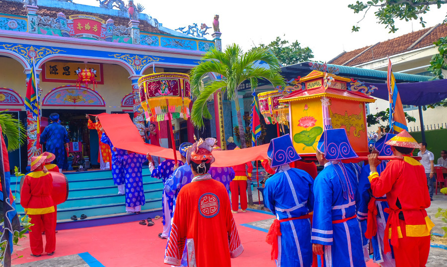 Nghi lễ nghinh thần nhập điện trong Lễ hội thanh minh của cư dân làng biển Nhơn Hải diễn ra trang nghiêm tại bãi biển chiều 27-2. Ảnh: Ngọc Nhuận