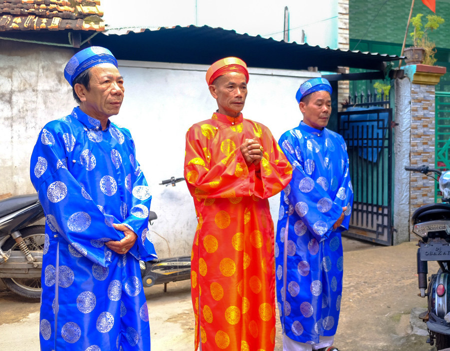 Chánh tế (đứng giữa) và hai bồi tế thực hiện nghi lễ cúng khai tỉnh (thần giếng) tại vị trí ngày xưa có giếng cổ của làng là nơi cung cấp nguồn nước sinh hoạt cho cả làng. Hiện tại, giếng nước đã bị lấp theo sự phát triển của xã hội, nhưng nghi lễ cổ truyền vẫn thực hiện tại vị trí này. Ảnh: Ngọc Nhuận