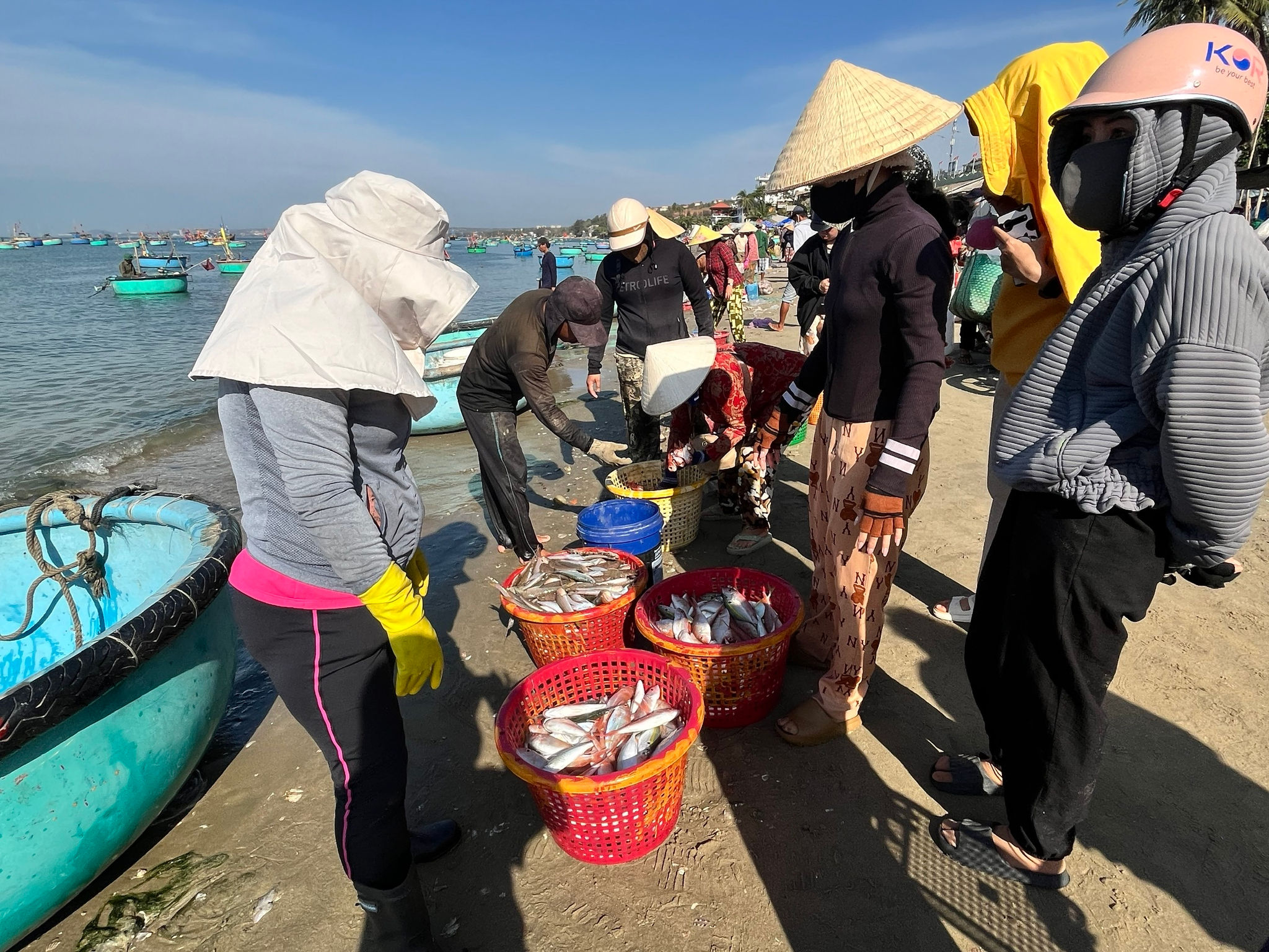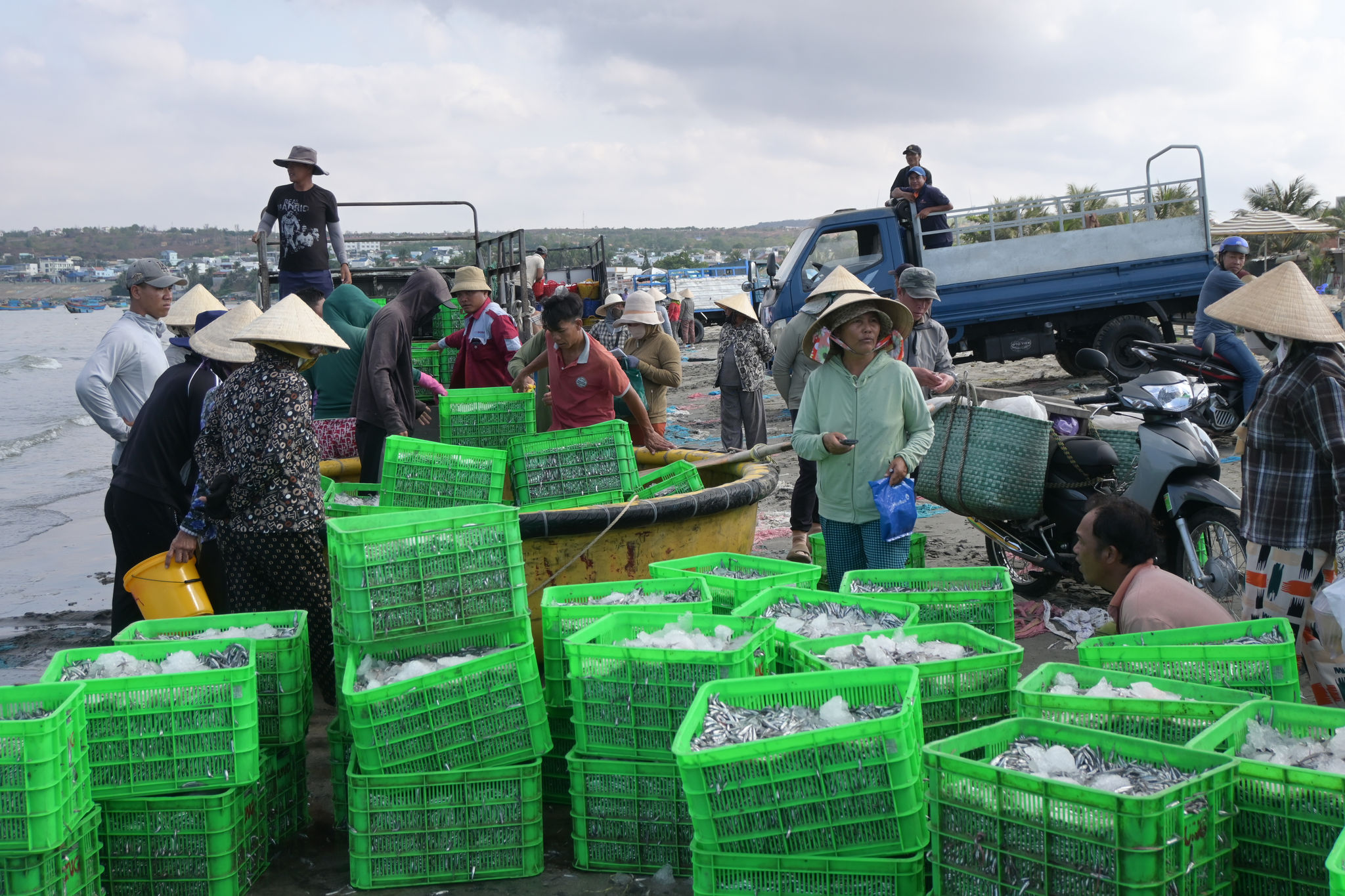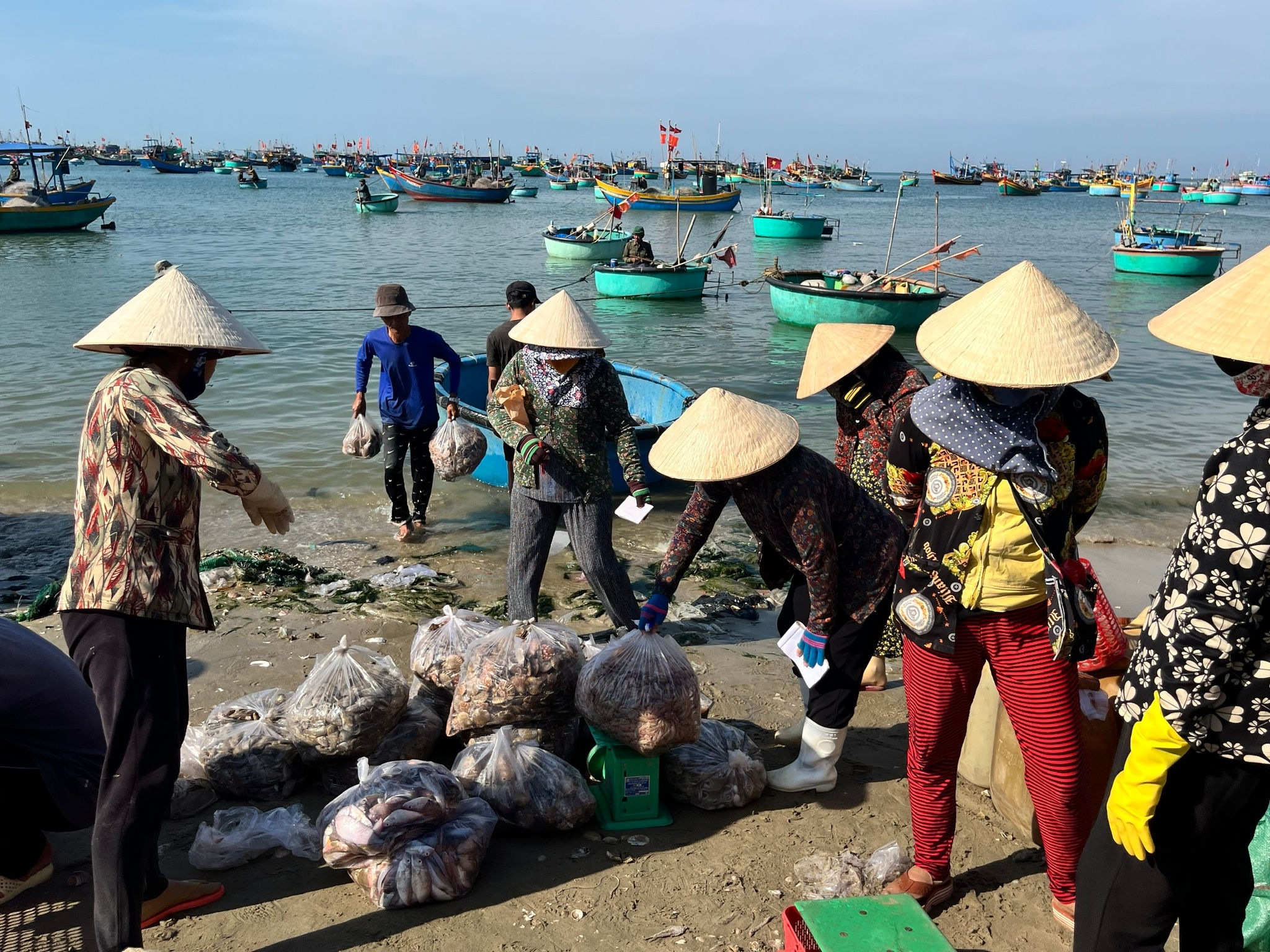 Trên bờ, các thương lái đã có mặt từ sớm, ghe vừa vào là họ ra giá, trao đổi tấp nập. Tiếng mua bán râm ran, báo hiệu một ngày ngư dân làm ăn khấm khá.