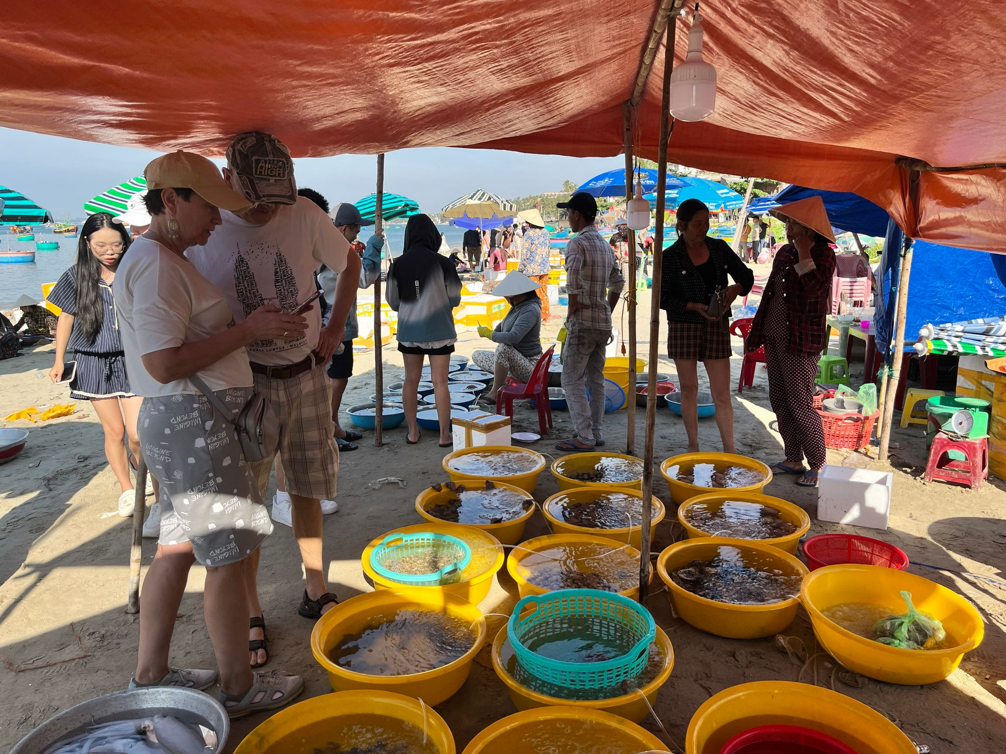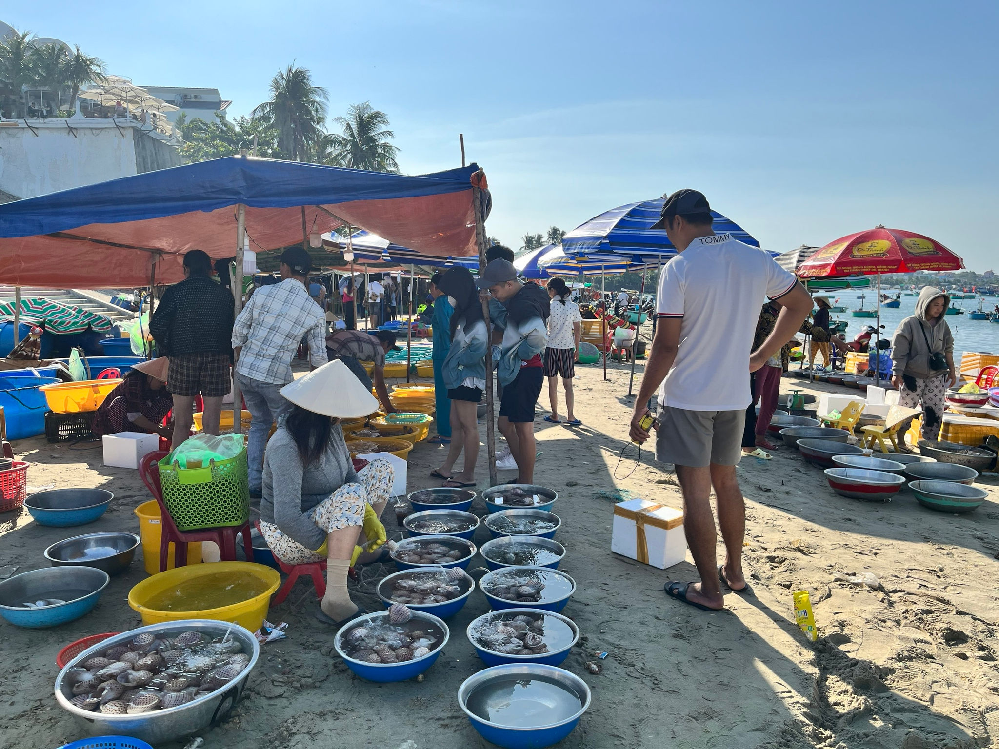 Cách đó không xa, chợ hải sản dành cho khách du lịch cũng nhộn nhịp không kém. Điểm đặc biệt ở chợ hải sản này là tiểu thương bán bằng thau, những loài ốc nhỏ như ốc nhảy, ốc giấy, nghêu… sẽ được bán nguyên thau có giá vài trăm ngàn đồng.