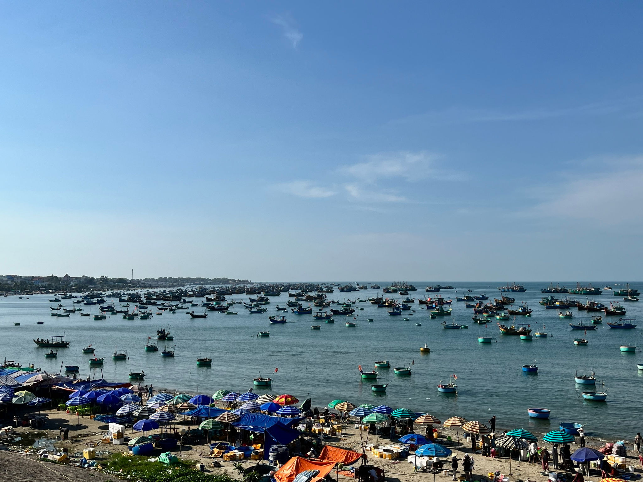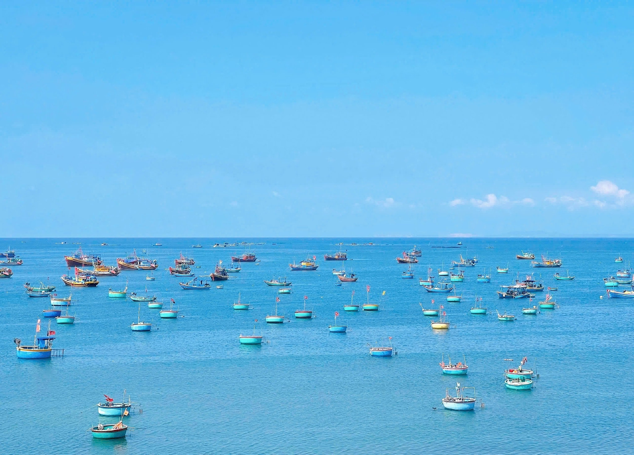 Từ trên cao phóng tầm mắt ra xa, thuyền thúng giống như những điểm nhấn sinh động giữa nền biển xanh, phản ánh nét độc đáo trong đời sống lao động của cư dân làng chài Mũi Né. Chính vẻ đẹp bình dị ấy đã níu chân những du khách khó tính nhất.