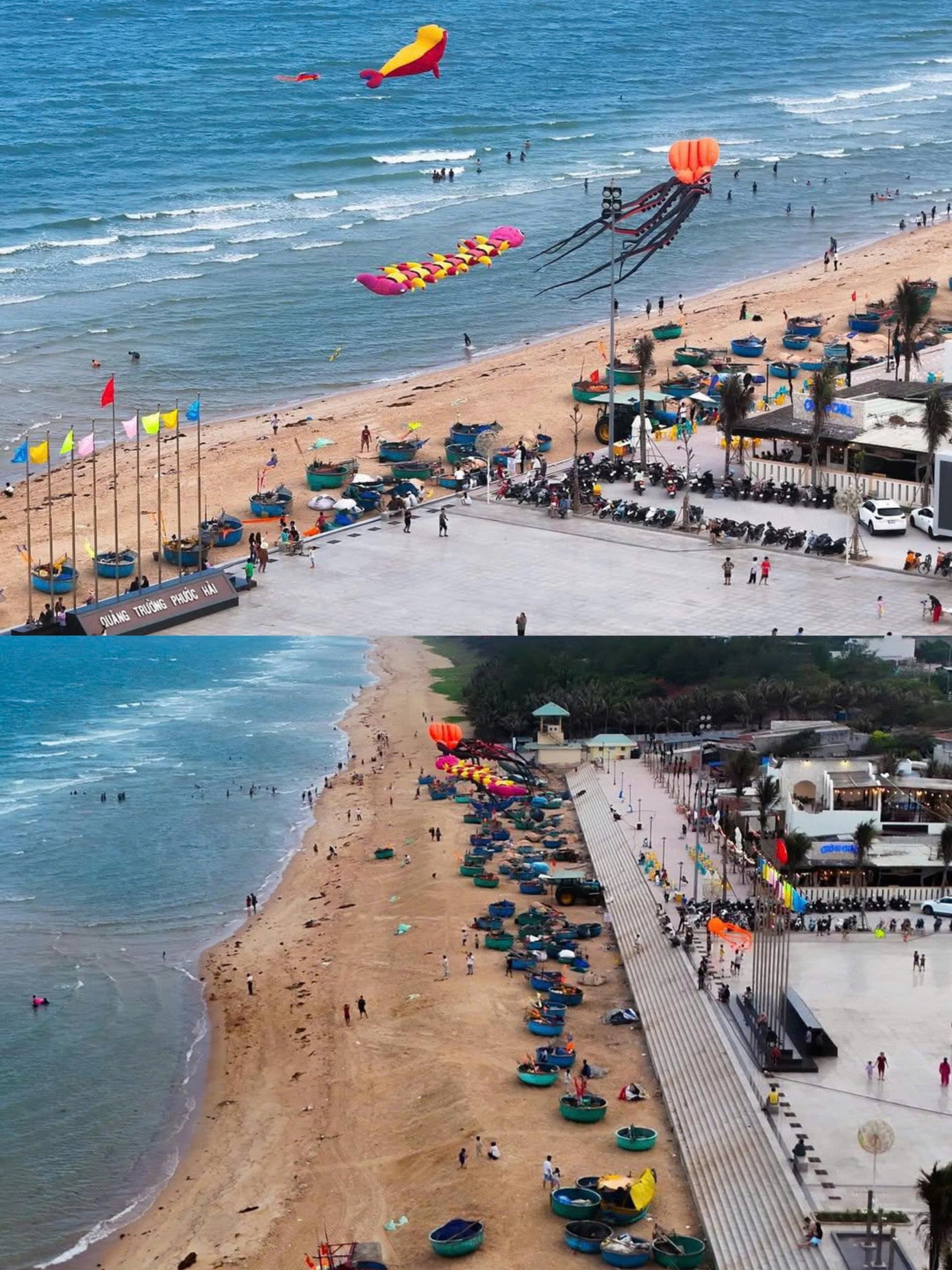 Nằm ngay sát bờ biển, quảng trường Phước Hải là điểm vui chơi, tụ tập quen thuộc của người dân địa phương và du khách. Điểm nhấn đặc trưng là những chiếc thuyền thúng tròn xinh nằm san sát nhau trên bãi cát vàng, tạo nên một nét riêng của làng chài. Vào cuối tuần, khu vực này trở nên sống động hơn với nhiều hoạt động giải trí, nổi bật là lễ hội thả diều đầy màu sắc.